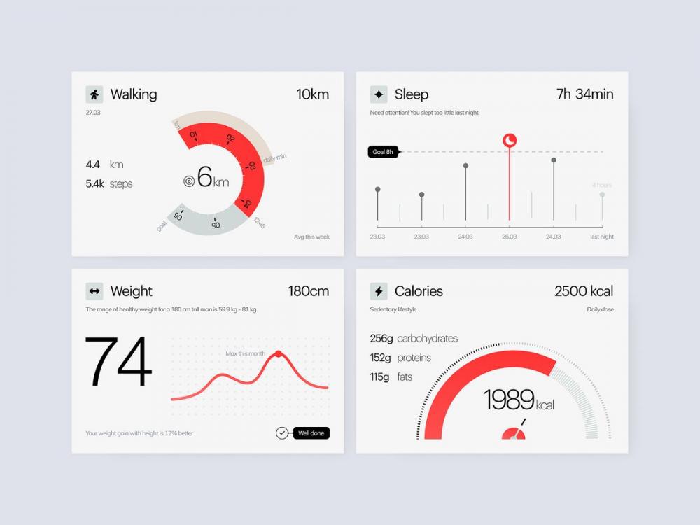視覺(jué)層面選用暖調(diào)活力色系作為主色,搭配低飽和度淺灰與白色作為基底,弱化視覺(jué)壓迫感,打造柔和舒適的視覺(jué)氛圍。布局上采用清晰的卡片式模塊化設(shè)計(jì),將步數(shù)、體重、身體指標(biāo)、運(yùn)動(dòng)計(jì)劃、營(yíng)養(yǎng)攝入等核心功能分區(qū)歸類,信息層級(jí)分明,用戶無(wú)需花費(fèi)過(guò)多時(shí)間梳理,就能快速抓取關(guān)鍵健康數(shù)據(jù),徹底避免信息雜亂、視覺(jué)過(guò)載的問(wèn)題。