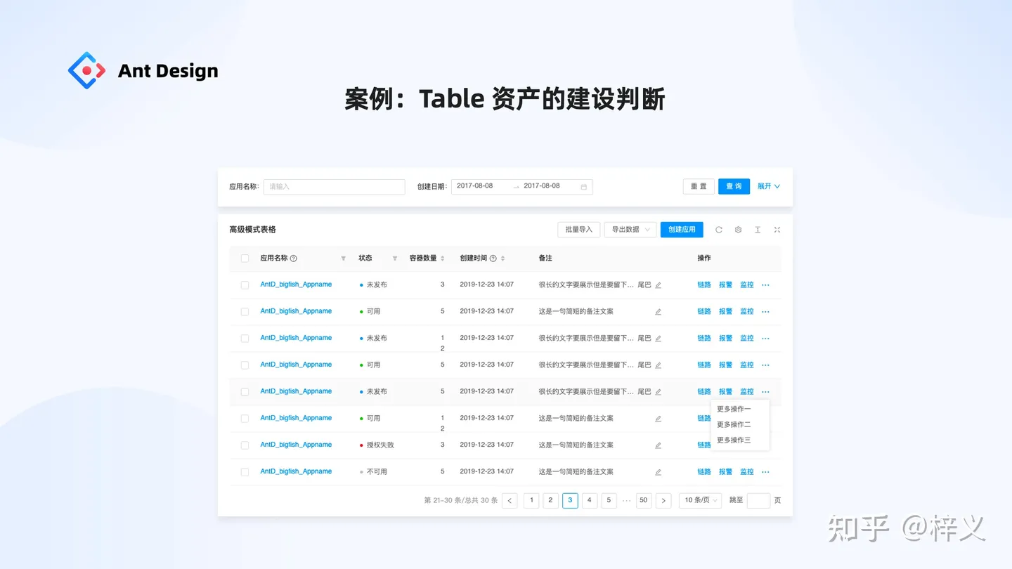 表格常用于展示同類結構下的多種數據,易于組織、對比和分析等,并可對數據進行搜索、篩選、排序等操作。一般包括表頭、數據行和表尾三部分