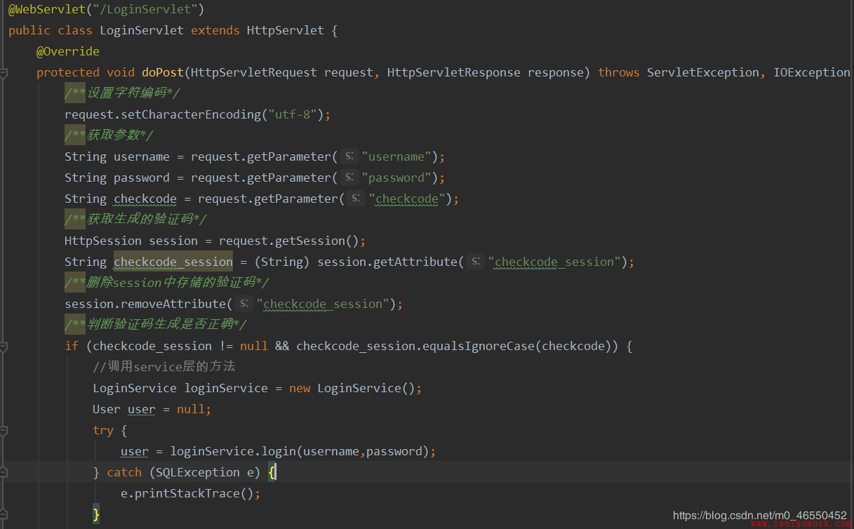 如下圖所示,為了保證servlet層能夠正確接收到界面所展示的驗證碼信息,同時因為session對象是項目自生成的,所以我直接獲取session對象并以類似于鍵值對的形式將頁面驗證碼信息存入session中。