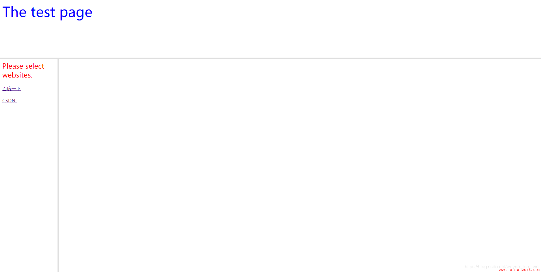 <html> <head></head> <frameset rows="500,*" border="3" noresize="noresize"> </frame> </html>看上面的代碼,用frameset替換掉body不難理解,畢竟我們約定做框架的網頁不具有實體內容 接著,這里提到了框架標簽的三個屬性,分別為: rows/cols 框架的分行或分列 border 分隔框的寬度 noresize 大小是否可調 現在來分別解釋一下 第一個,rows 或cols 屬性,代表了框架的分行或分列的情況,在引號內書寫該屬性的值的時候,不需要指明分成幾欄,只需要指明每一欄占據的寬度或高度(單位為像素)并使用逗號隔開。瀏覽器在解析的時候會計算到底分成了幾欄。另外,不指定寬度而使其占據剩余位置時,可以使用通配符 “ * ”。 第二個,border 屬性,代表了分隔框的寬度,這是屬性的數值單位是像素。所以如果你不想加入邊框,則可以將它設置為零。 第三個,noresize 屬性,表示我們的框架的大小是否可調,frameset標簽默認為大小可調,當用戶鼠標移動到邊框上時,他可以拖拽改變大小。所以如果不想讓用戶隨意改變框架大小,那么可以選擇使用這個屬性 (當然,也可以選擇把邊框的寬度設為零,讓他找不到)。 這個屬性的值同屬性名稱一樣。 最后還需要說明的是:框架集標簽是可以進行嵌套的,也就是說,在已經分出來的框架中,我們可以借著分欄。 在框架內鑲嵌網頁 剛剛我們使用 frameset 標簽將網頁變成框架并劃分成了若干區域,每一個區域都是一個單獨的可顯示頁面的子網頁(筆者起的名)。現在,我們需要在這些區域內為它鑲嵌上一個網頁,這需要用到frame這個單標簽在框架下添加網頁,它的寫法如下: <frame src="...." name="...." /> 1 這里可以看到 frame 標簽的兩個屬性; src 和 name 。它們分別代表著添置連接(這是一個超鏈接,網頁,HTML文件,圖片等都是可以的。有關超鏈接的信息,可參照上一篇學習總結或者問問度娘 ),以及框架名稱。 框架的命名,很主要的一個原因在于可以重復利用一個框架,即在其他標簽使用時,可以在某個框架上顯示相應內容。還記得上一篇中,我們提到的鏈接標簽 target 屬性中的 “某框架名稱” 這個值嗎?在為框架命名后,就可以使用上述的 target 用法,將打開的網頁放在某個框架中了。 綜上,舉個例子: 先來創造一個帶有嵌套的框架<!--frame--> <html> <head></head> <frameset rows="200,*" border="5" noresize="noresize"> <frame src="title.html" name="title" /> <frameset cols="200,*"> <frame src="selection_bar.html" /> <frame name="output_page" /> </frameset> </frameset> </html><!--title--> <html> <head></head> <body> <font size="7" color="blue"> The test page </font> </body> </html>