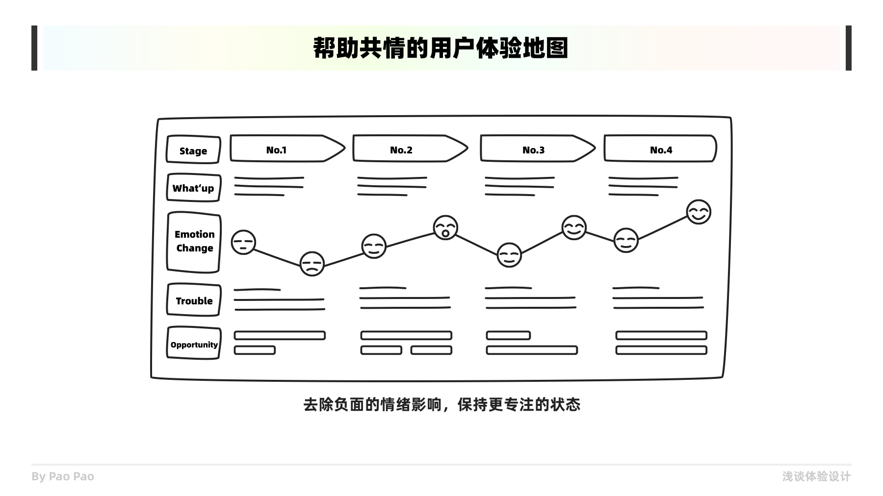 圖表、筆記、錄制設(shè)備是幫助我們共情的最好工具,在不同的場景下,這些工具能夠幫助我們更好的收集信息,并且便于我們思考和共情。我們在短時間能記住的信息是有限的,這也是為什么我們會用到7±2這種定律去控制信息量的原因。以用戶體驗地圖為例,在記載用戶體驗產(chǎn)品的過程中,便是一種很好的共情輔助工具,它能夠按照使用步驟或階段記載用戶使用情況和情緒變化等反饋。