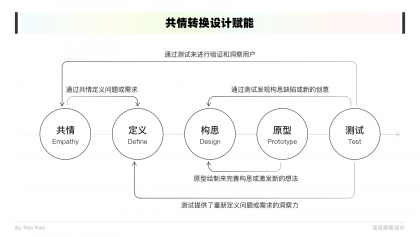 最后便是共情結(jié)果如何應(yīng)用到設(shè)計之中,將共情結(jié)果賦能到產(chǎn)品設(shè)計也是共情工作的價值所在。通常這套流程是共情->定義->構(gòu)思->原型->測試,在這個整個過程中隨時是可以返回到前面其他階段中反復(fù)打磨的,而共情作為一個起點也揭示了其重要性。我們一切的共情工作皆為了能夠優(yōu)化和解決產(chǎn)品的問題,使得產(chǎn)品體驗?zāi)軌蚋茫@是我們在體驗設(shè)計中不斷去共情的初衷。