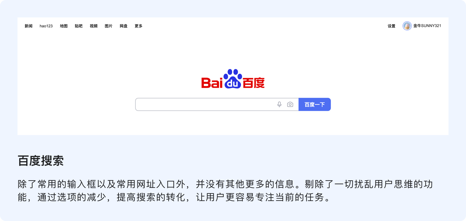 網頁通過大面積的留白營造平和感,通過高反差的對比創造視覺焦點,將必要的信息烘托出來,然后借助留白包圍它們。通過這種方式把核心信息凸顯出來,當用戶進入該搜索頁時,只做必要的事情,關注重要的信息。