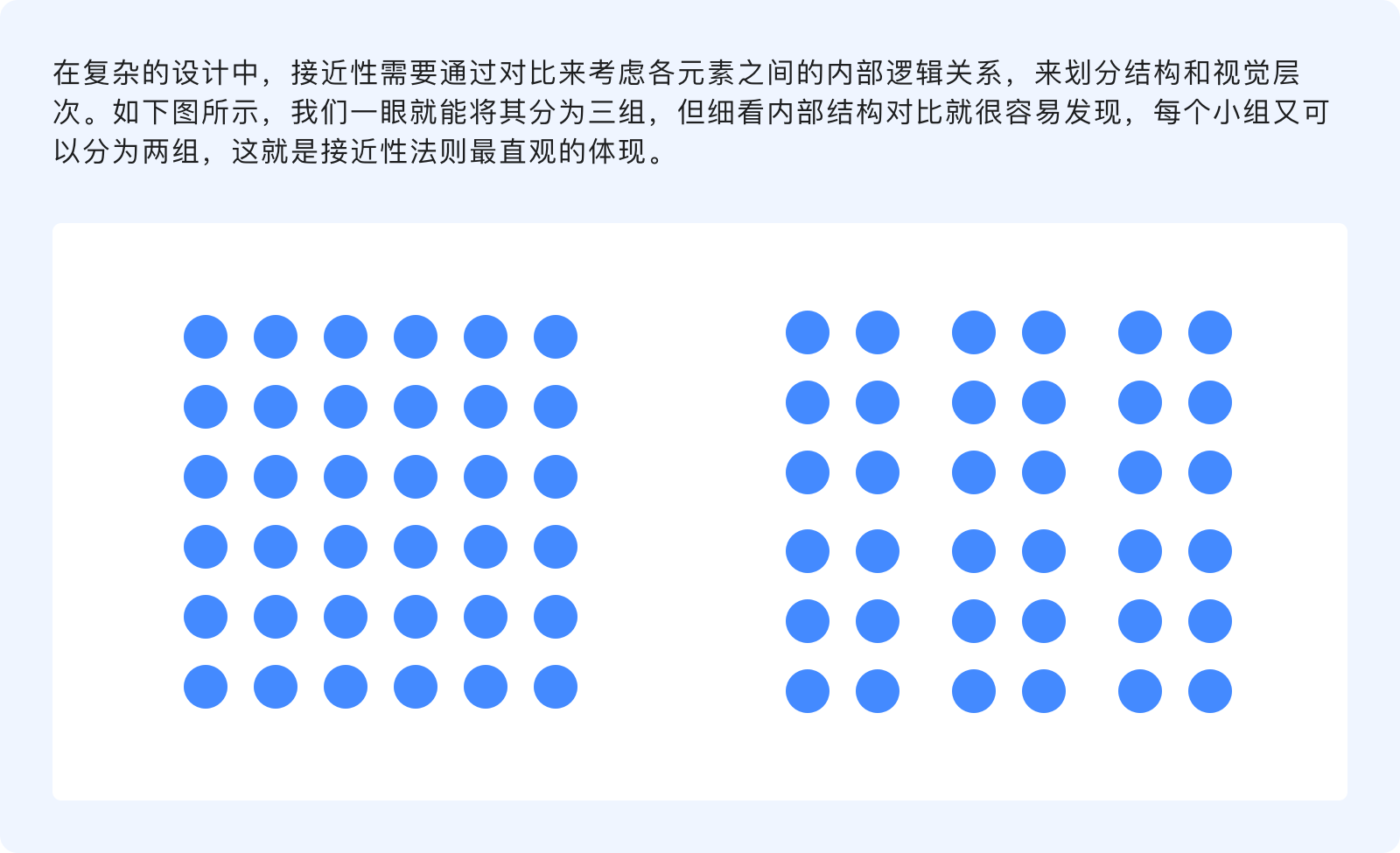 接近性原則指出,物體之間的相對距離會影響我們感知它們的關(guān)系,元素之間越是接近,組合在一起的可能性就越大,會被看作成一個整體,反之那些距離較遠(yuǎn)的則自動劃分到組外。