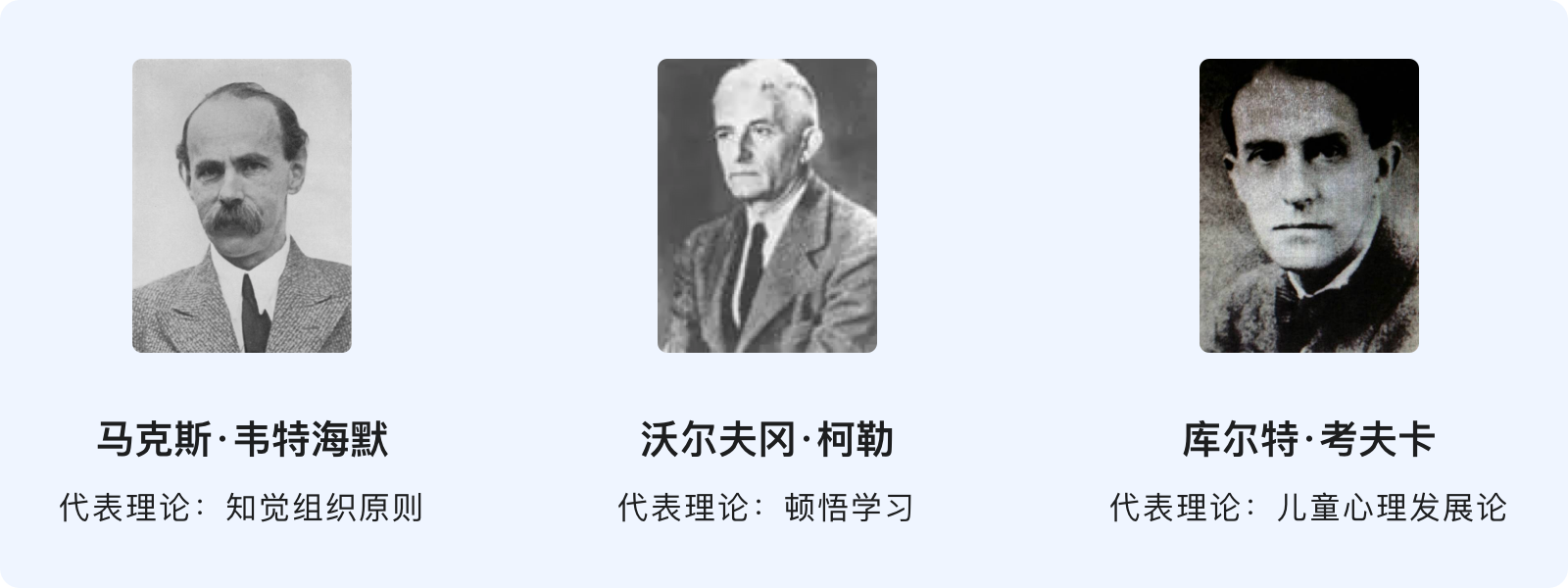 格式塔的德文為“Gestalt”,意思為「形狀」和「圖形」,在心理學(xué)中可以看作是任何一種被分離的整體。格式塔心理學(xué)的研究源于視知覺,是現(xiàn)代認(rèn)知主義學(xué)習(xí)理論的先驅(qū),為后來的社會心理學(xué)的發(fā)展打下了堅實的基礎(chǔ),其創(chuàng)始人是韋特海墨、考夫卡和苛勒。