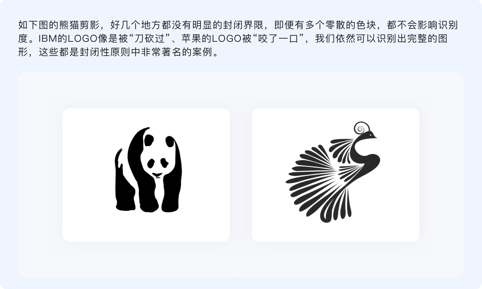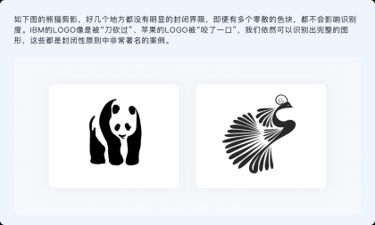 封閉性原則指出,人們的視覺系統(tǒng)傾向于將不完整的局部當(dāng)做一個整體來感知。看起來與連續(xù)性有諸多相似,不過連續(xù)性是通過物體的形狀和運動方向、按照視覺慣性來制定閉合規(guī)律,而封閉性則并無特定規(guī)律,只要把握好不完整物體的尺度、使各元素之間相互輔助,就能讓其與我們認(rèn)知模型中的原型匹配。