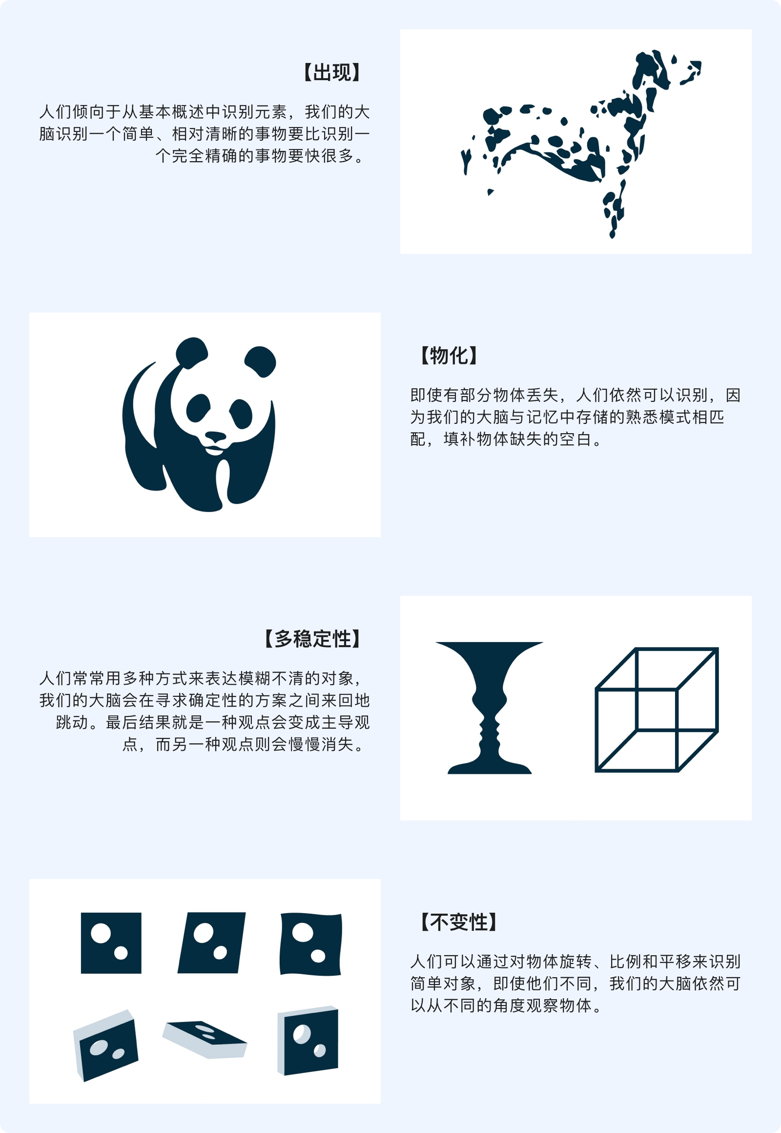 格式塔原理試圖解釋人們在合適的情況下如何看待視覺元素。這些建立在四個關(guān)鍵想法上:【出現(xiàn)】、【物化】、【多穩(wěn)定性】、【不變性】。