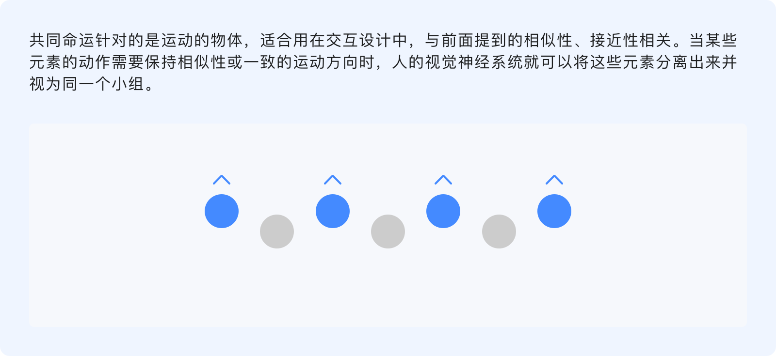 共同命運原則指出,人們傾向于將具有共同運動形式的事物感知為一個彼此相關(guān)的整體,無論元素之間的距離有多遠(yuǎn)、或其他屬性(形狀、顏色、大小)各異,但只要沿著相同的方向、相同的速度運動,共同命運就會將其歸類。