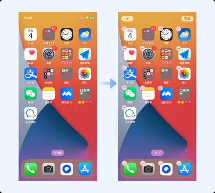 移動端產(chǎn)品中有很多這樣的案例,如iOS系統(tǒng)中,長按刪除某個APP時,所有桌面圖標(biāo)會抖動、且左上角都有一個相同的刪除圖標(biāo),通過一致性的動作告知用戶圖標(biāo)的可操作狀態(tài),非常直觀。