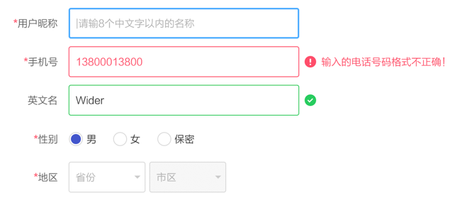 當輸入有誤時,盡量避免彈出框提示,可以直接對輸入框設計不同的狀態顯示默認狀態、選中狀態、錯誤狀態、成功狀態。