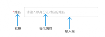 一個輸入框,通常有標簽名稱label、提示信息placeholder(輸入信息后提示文字消失)、初始值value(需手動刪除)。如果是必填表單,在適當位置(標簽的前后,輸入框后)加上紅色*號(或其他符號)