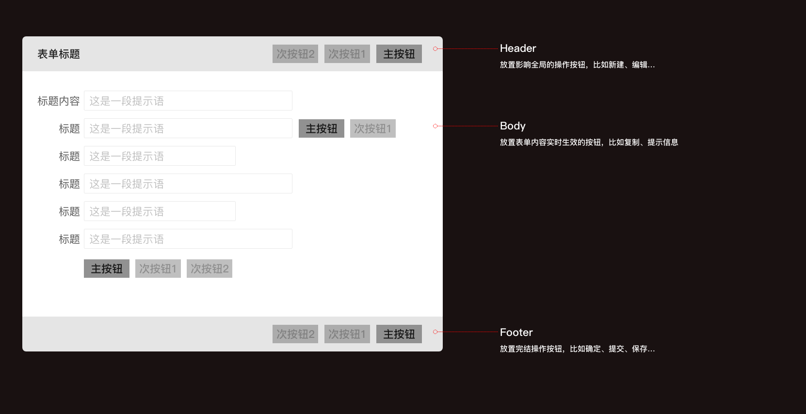 表單中比較常見(jiàn)的按鈕大概有“保存”、“提交”、“取消”、“關(guān)閉”、“暫存”、“下一步”、“上一步”...由于B端產(chǎn)品業(yè)務(wù)邏輯較復(fù)雜通常頁(yè)面中會(huì)有很多操作按鈕,為了更快捷準(zhǔn)確的操作,就需要對(duì)按鈕按照重要程度分為主按鈕,次級(jí)按鈕;為了達(dá)到這樣的目的僅僅依靠按鈕樣式還遠(yuǎn)遠(yuǎn)不夠,還得根據(jù)視覺(jué)動(dòng)線給出合理的排列順序。關(guān)于按鈕順序,最常見(jiàn)的疑問(wèn)是主按鈕應(yīng)該在次級(jí)按鈕左邊還是右邊,這里建議使用基于Ant Design 的設(shè)計(jì)原則,將規(guī)范定為:左對(duì)齊從左往右閱讀,右對(duì)齊從右往左閱讀;