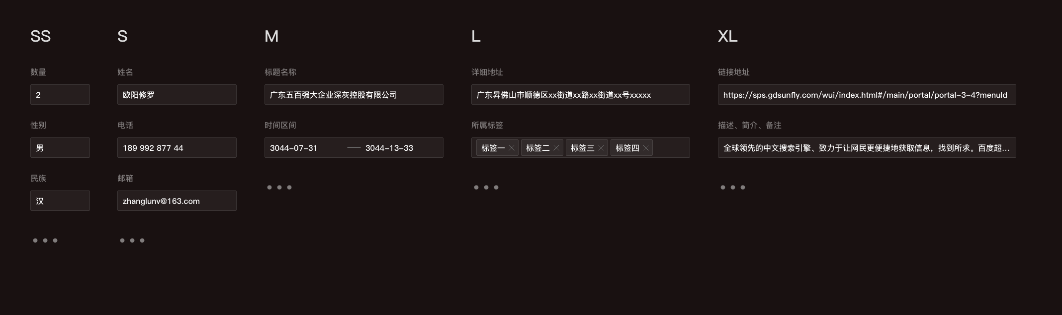 超短(XS):用于短數(shù)字、超短文本 短(S):適用于較短文本輸入,如個(gè)人信息(姓名、電話、郵箱等) 標(biāo)準(zhǔn)(M):默認(rèn)輸入框長(zhǎng)度,適用大多數(shù)情況 長(zhǎng)(L):適用較長(zhǎng)文本輸入,如網(wǎng)頁(yè)地址、標(biāo)簽組等 超長(zhǎng)(XL):適用超長(zhǎng)文本輸入如正文(描述信息、備注、摘要、介紹、備注)、超長(zhǎng)鏈接等選擇合適的輸入框?qū)挾瓤梢詫?duì)使用者產(chǎn)生一定的心理暗示從而來(lái)減輕使用者的心理負(fù)擔(dān),因?yàn)樵诳吹阶侄螛?biāo)題時(shí),心理都會(huì)產(chǎn)生對(duì)所填信息的預(yù)期,大概我要填寫什么,如果選用的輸入框?qū)挾炔缓线m一方面會(huì)對(duì)使用者造成一定的填寫負(fù)擔(dān),同時(shí)還會(huì)對(duì)用戶產(chǎn)生一定程度的誤導(dǎo)。比如:填寫戶籍所在地時(shí),如果輸入框給的太寬就會(huì)疑惑,到底應(yīng)該寫“xx省xx市”、還是應(yīng)該填到具體“省-市-區(qū)-街道-xx號(hào)”呢?當(dāng)遇到更復(fù)雜的場(chǎng)景和混排輸入框的情況,為了讓頁(yè)面呈現(xiàn)的內(nèi)容更加有序、整齊,可參照山歌系統(tǒng)的定義方式來(lái)定義5種梯度寬度,從而方便設(shè)計(jì)執(zhí)行和技術(shù)開(kāi)發(fā)。比如定義為 A=超短(XS)的寬度;短(S)的寬度=2A+n;以此類推