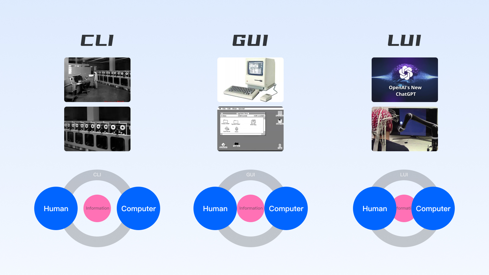 界面交互的需求繁榮得益于圖形交互的興起和市場(chǎng)的發(fā)展,從CLI(命令行)→GUI(圖形交互)→LUI(自然語(yǔ)言交互),對(duì)設(shè)計(jì)服務(wù)的要求自然不同: