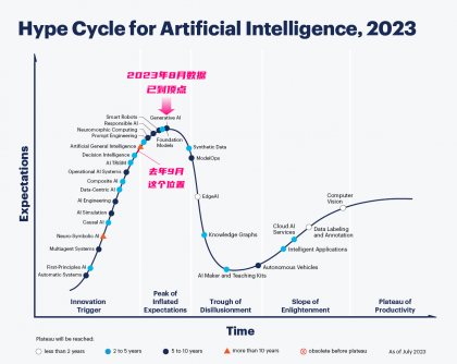 去年9月份,「Gartner」就預(yù)測(cè)生成式AI已經(jīng)進(jìn)入期望膨脹高位,到2023年8月「Gartner」剛發(fā)布人工智能技術(shù)成熟度曲線,生成式AI從技術(shù)萌芽期到技術(shù)膨脹期的頂峰,跟過去一段時(shí)間AI在學(xué)術(shù)、產(chǎn)業(yè)、資本領(lǐng)域的爆火完全呼應(yīng)。