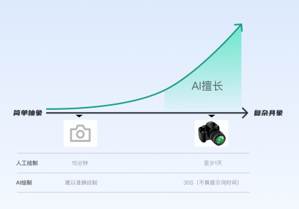 不考慮思考過程時(shí)間消耗,將人工手繪和AI繪制對(duì)比,AI可能無法穩(wěn)定的繪制靠左的相機(jī)圖形,但可以很快、較穩(wěn)定的繪制右邊的相機(jī),而人去繪制右邊相機(jī)可能需要至少一天時(shí)間,還不一定有AI效果好。