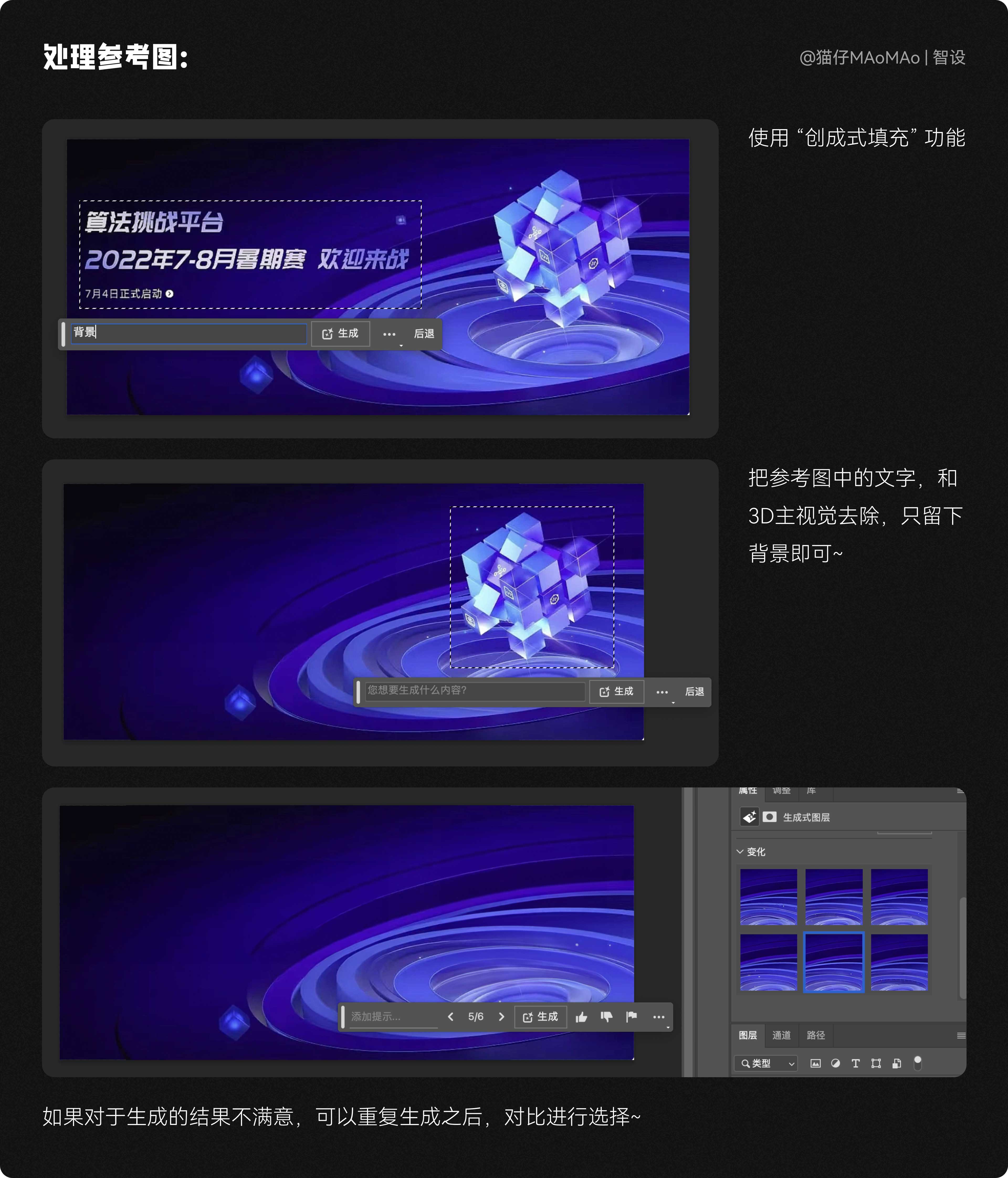 盡管AI現在可以輔助我們進行設計,但設計師的審美和基本功仍然至關重要,在輸出核心素材時,我們需要通過不斷微調細節,從大量素材中精挑細選出最合適的那一個,最終得到我們需要的背景素材圖。