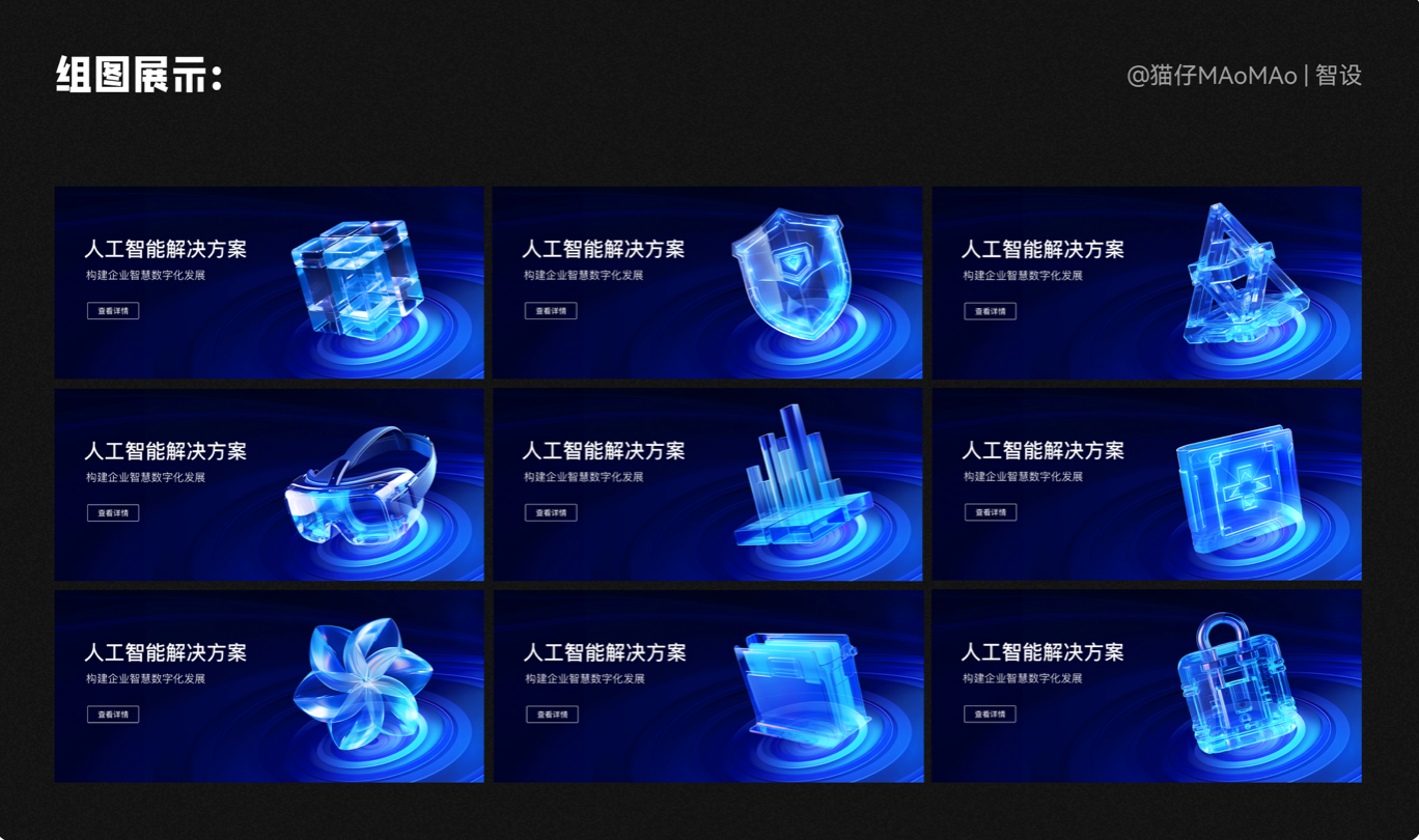 這一步考驗的是設計師的審美和手活,我們需要把背景和主視覺素材,進行視覺合成,其實也非常簡單:這里我定的主要色調是藍色+青色的光感,首先需要將色調整體統一;然后想要表現出玻璃質感的通透,我們需要加上一些光感;最后文字排版出圖即可~