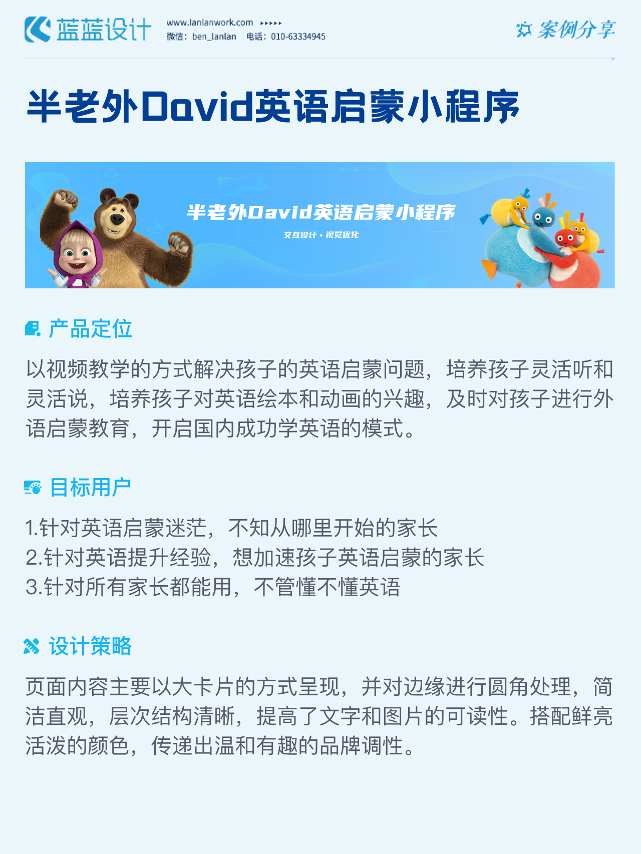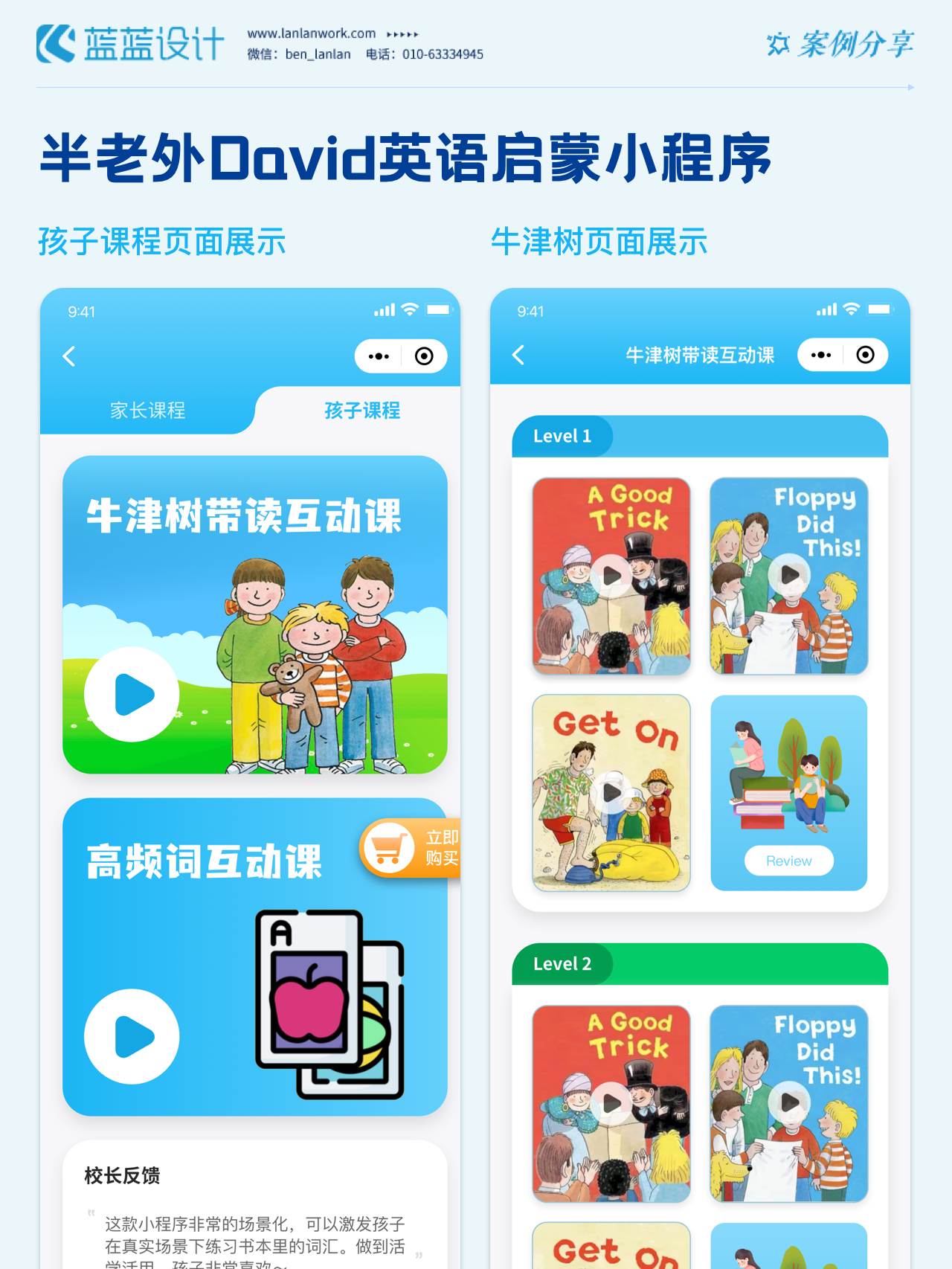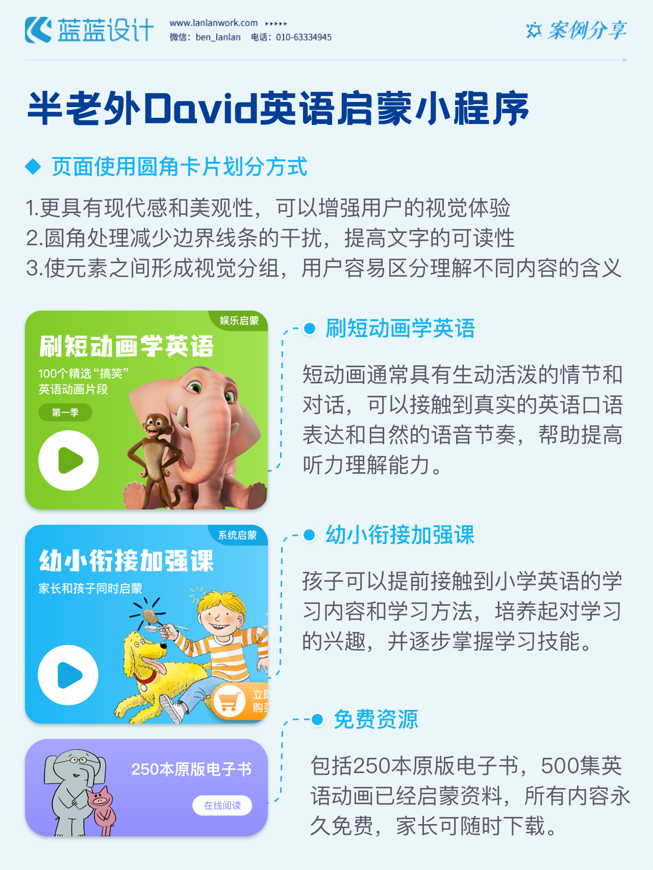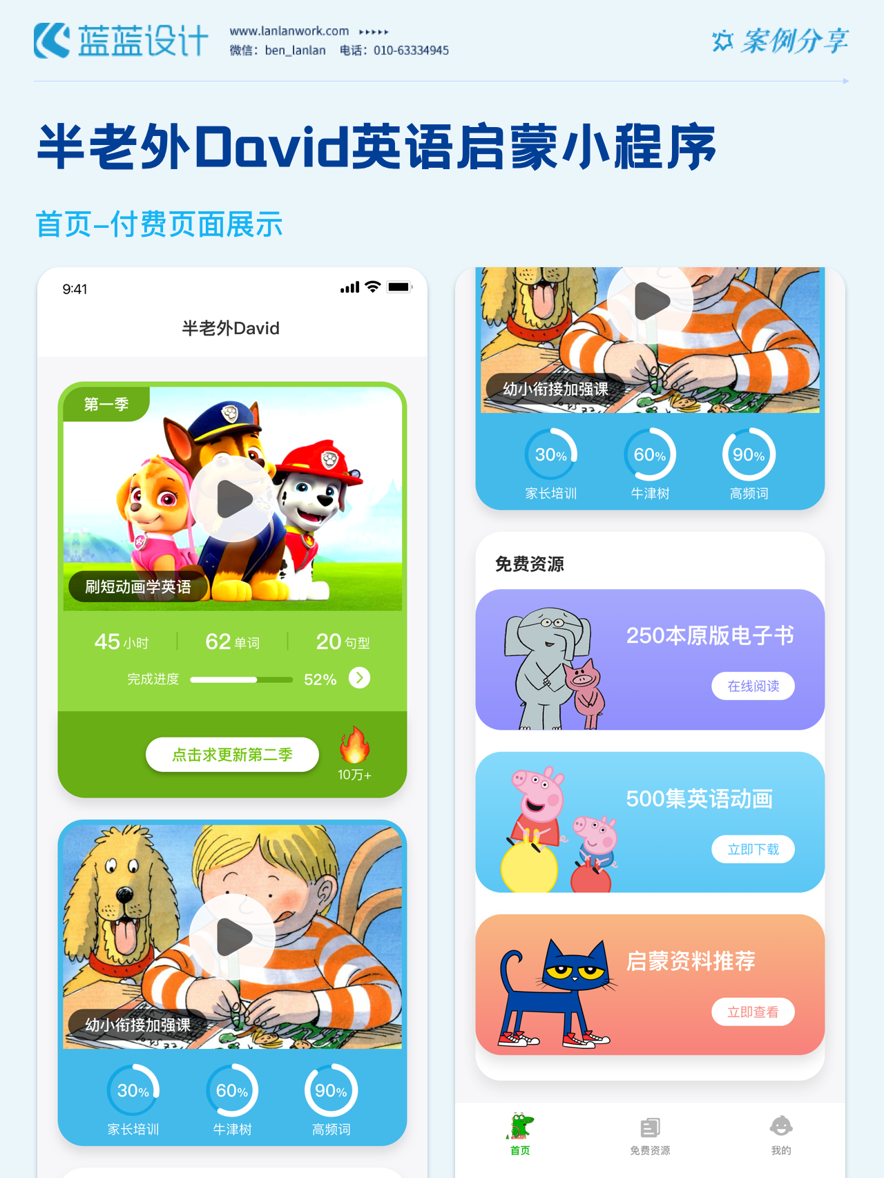 藍藍設計負責半老外David英語啟蒙小程序的界面整體風格和細節優化工作,也包括圖片優化等諸多視覺內容。前期雙方通過不斷溝通和深入了解最終確定了頁面的風格樣式??匆曨l學英語的方式更容易為孩子所接受,頁面的簡潔風格和顏色應用更加吸引兒童。