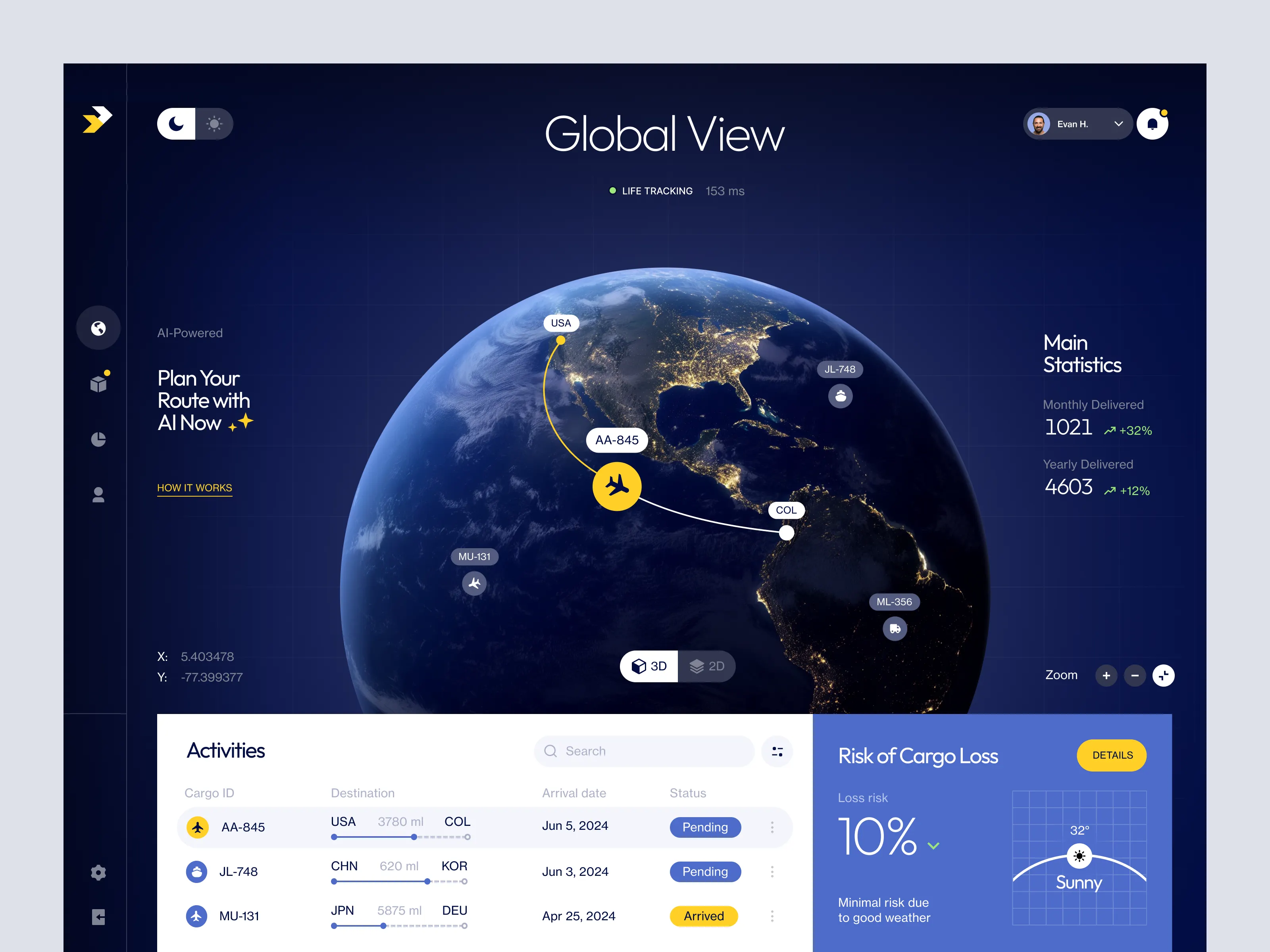 • 深色模式應用:右上角的“Global View”使用了深色宇宙背景,科技感和沉浸感較強,與其他淺色UI形成對比。
