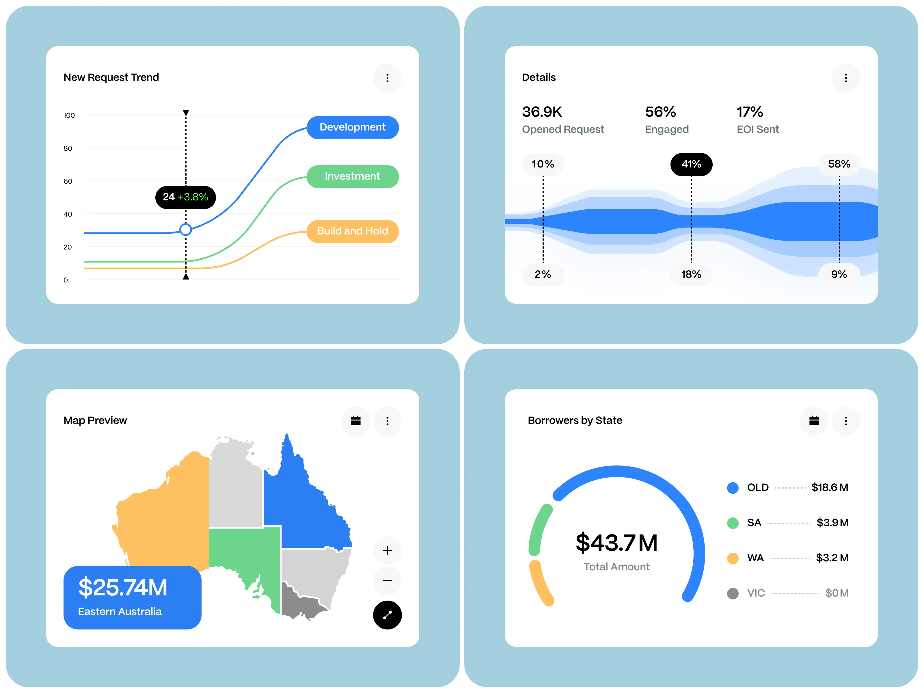 • 點綴色突出功能:藍色、綠色、橙色在圖表、按鈕和數(shù)據(jù)關鍵點上有選擇性使用,起到視覺引導作用。