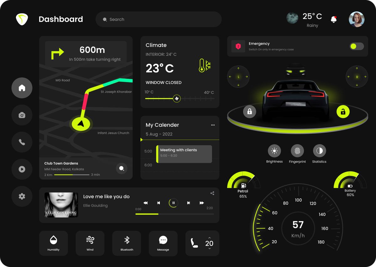 汽車中控是用戶出行的高頻交互場景,設計不僅要 “能用”,更要 “好用且愉悅”。這類界面將導航、車況、娛樂等功能整合,深色主題搭配熒光黃交互元素,既避免強光干擾駕駛,又讓操作區清晰可辨。實時路況、車輛能耗的直觀展示,音樂播放的便捷控制,都圍繞 “駕駛場景下的高效交互” 展開。這和我們的設計理念不謀而合 —— 科技產品的 UI,應模糊 “工具” 與 “伙伴” 的邊界,讓每一次使用都成為舒適的體驗。