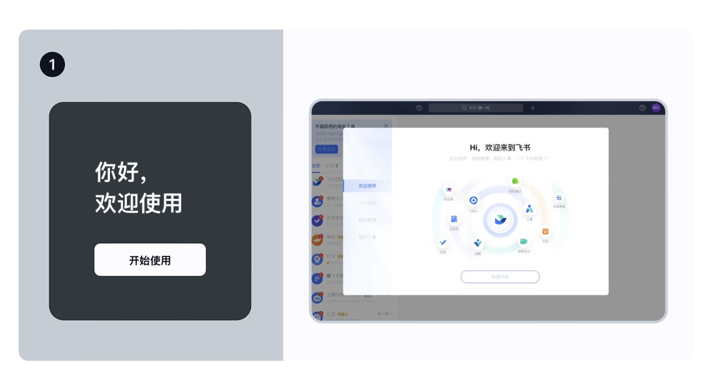 • 例子:飛書的歡迎頁會直接告訴用戶 “這里有辦公協作、云文檔、審批等功能”,既點明核心價值,又定下專業的辦公氛圍;