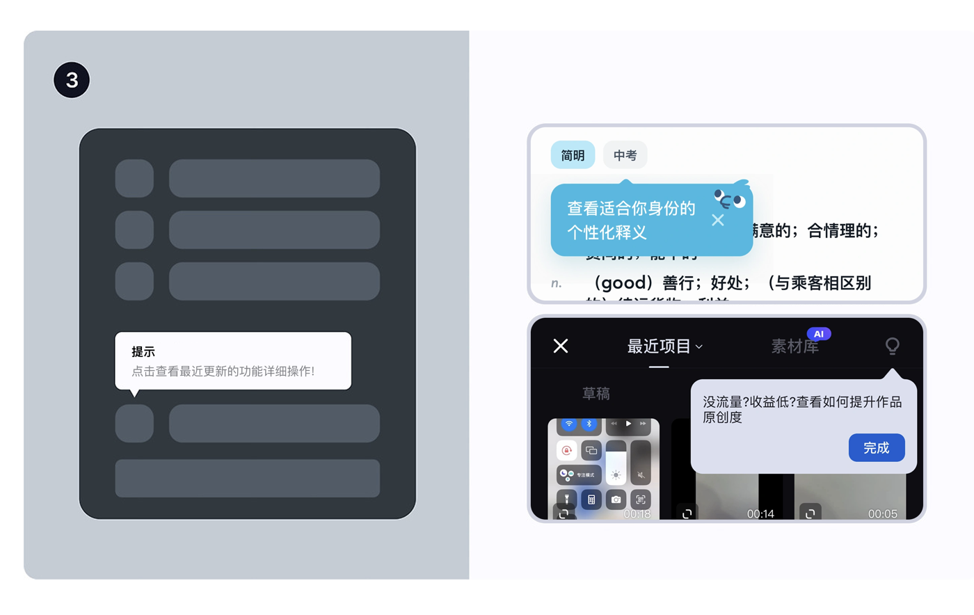 • 例子:視頻剪輯 APP 不用一上來就教 “怎么加轉場、調色”,先讓用戶學會 “導入視頻、剪片段”,等用戶想讓視頻更好看時,再在 “轉場” 按鈕旁加提示;