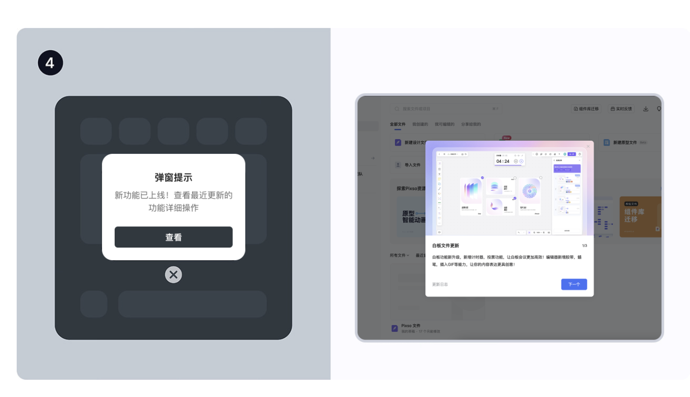 • 例子:Pixso 更新白板功能后,用彈窗提示 “新增計時器、投票功能”,用戶看完能直接點 “查看” 或 “關閉”;