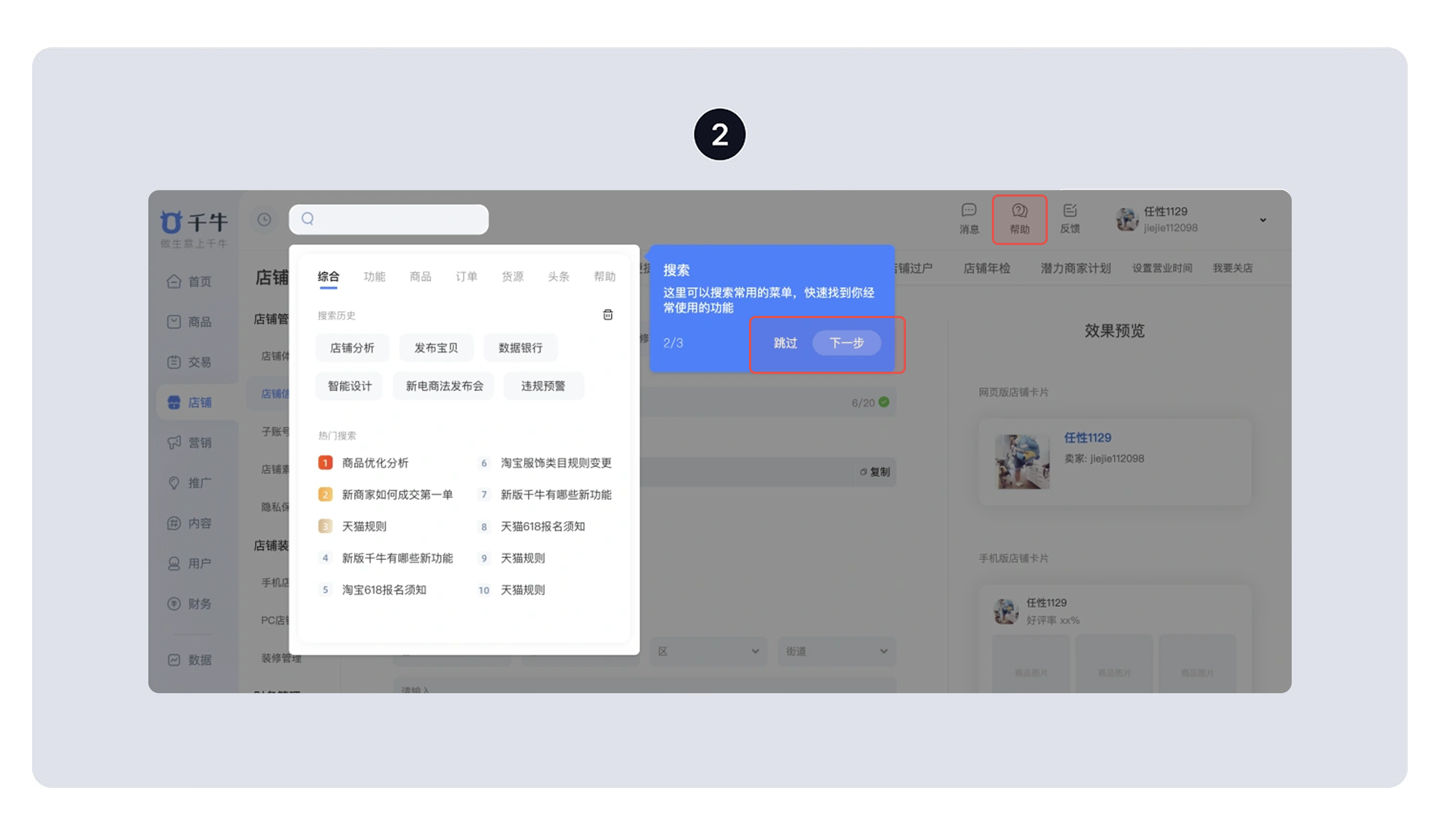 • 例子:千牛 APP 的新手引導會提示 “這里能搜索常用功能”,用戶可以點 “下一步” 繼續看,也能直接點 “跳過”;Notion 沒有強制引導,而是單獨做了 “幫助頁面”,用戶有問題再去查;