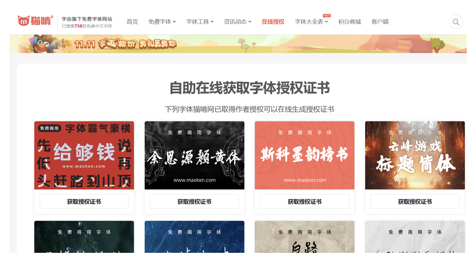 專注于中文字體的貓啃網,是個人設計師和小型工作室的福音。平臺已搜集 758 款免費商用中文字體,更新頻率高,經常能挖到新發布的優質字體,冷門小眾款也能在這里找到。