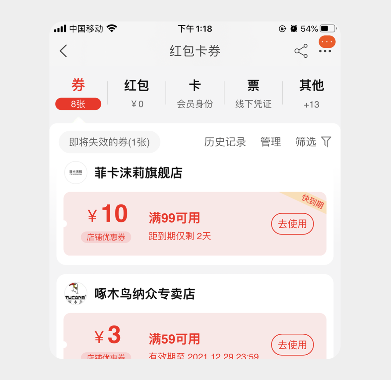 采用標題與副標題上下布局的形式,副標題精煉提煉核心信息或解釋標題含義,通過顏色變化區分選中與未選中狀態。像中國移動的紅包卡券頁面,標簽頁用 “券”“紅包”“卡” 作為標題,搭配簡潔副標題補充說明,用戶無需點擊就能快速了解各標簽下的內容,提升操作效率;基金產品的 “一筆投”“定投” 標簽頁,也通過副標題點明 “便捷”“穩健” 的核心差異,幫助用戶快速做選擇。