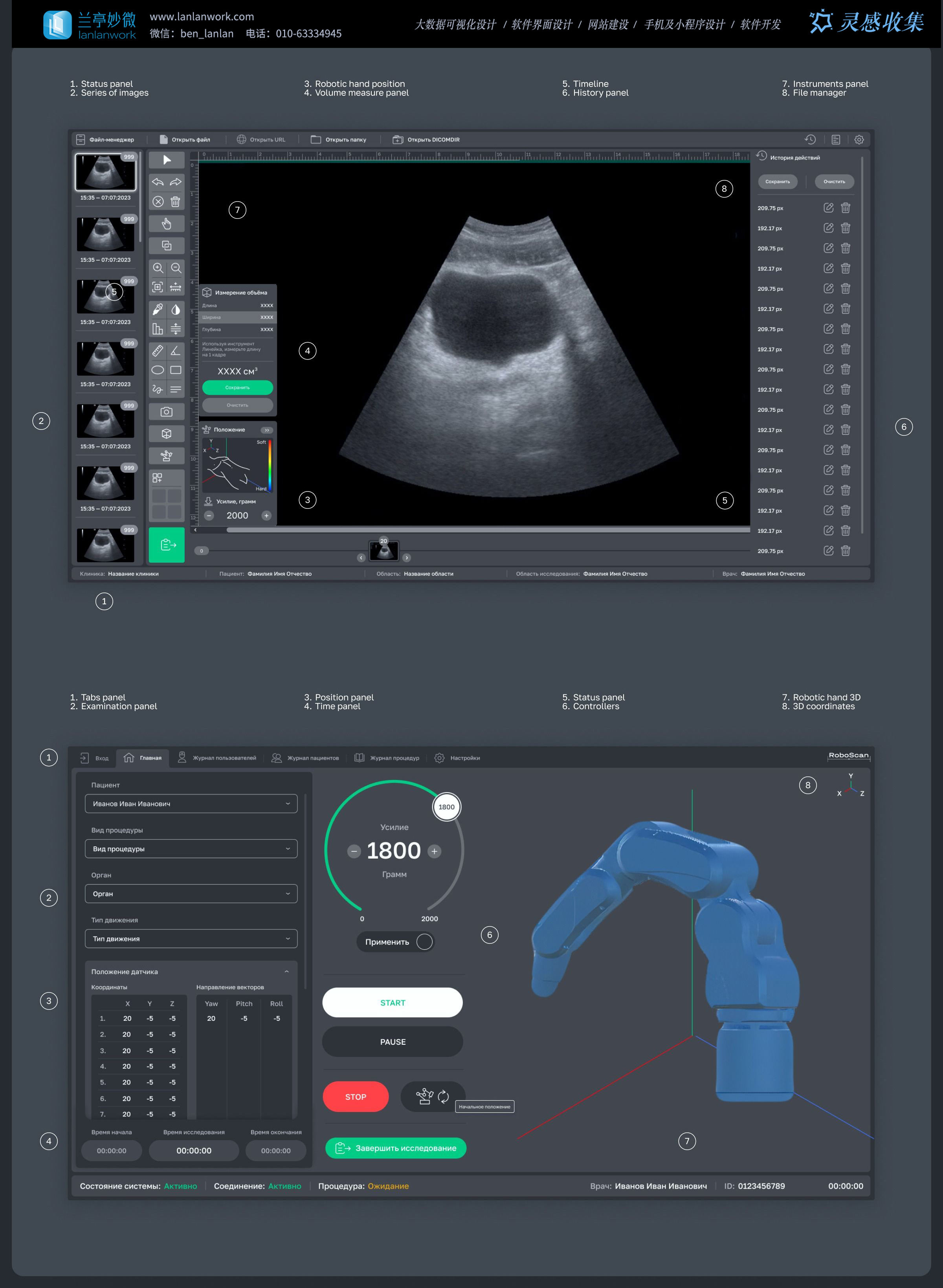 當醫(yī)療機器人界面還停留在 “設備控制 + 數(shù)據(jù)展示” 的分離邏輯時,蘭亭妙微這套超聲機器人系統(tǒng)界面,以「影像 - 操作雙維協(xié)同」的設計思路,重構了 “醫(yī)生 - 機器人 - 患者” 的交互關系。它不僅是一個操作面板,更是醫(yī)療機器人領域 “精準性與易用性平衡” 的標桿案例。
