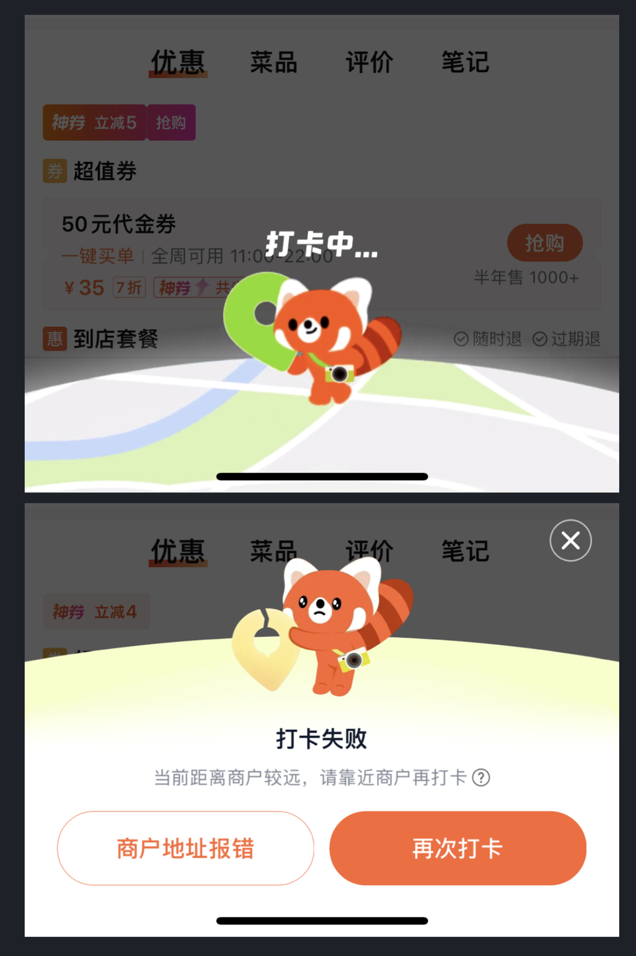 線下門店打卡活動(dòng)早已普及,但如何提升打卡的體驗(yàn)感?大眾點(diǎn)評(píng) App 給出了答案:點(diǎn)擊打卡后,會(huì)觸發(fā) IP 角色結(jié)合定位符號(hào)的動(dòng)畫效果,生動(dòng)傳遞 “到店” 的含義。同時(shí),若用戶距離商戶過遠(yuǎn),會(huì)明確提示 “打卡失敗”,保證打卡的真實(shí)性。這種動(dòng)態(tài)化的反饋?zhàn)尨蚩ㄐ袨椴辉偈呛唵蔚陌粹o點(diǎn)擊,而是充滿參與感的互動(dòng)過程,既提升了用戶的參與意愿,又讓活動(dòng)更具可信度。