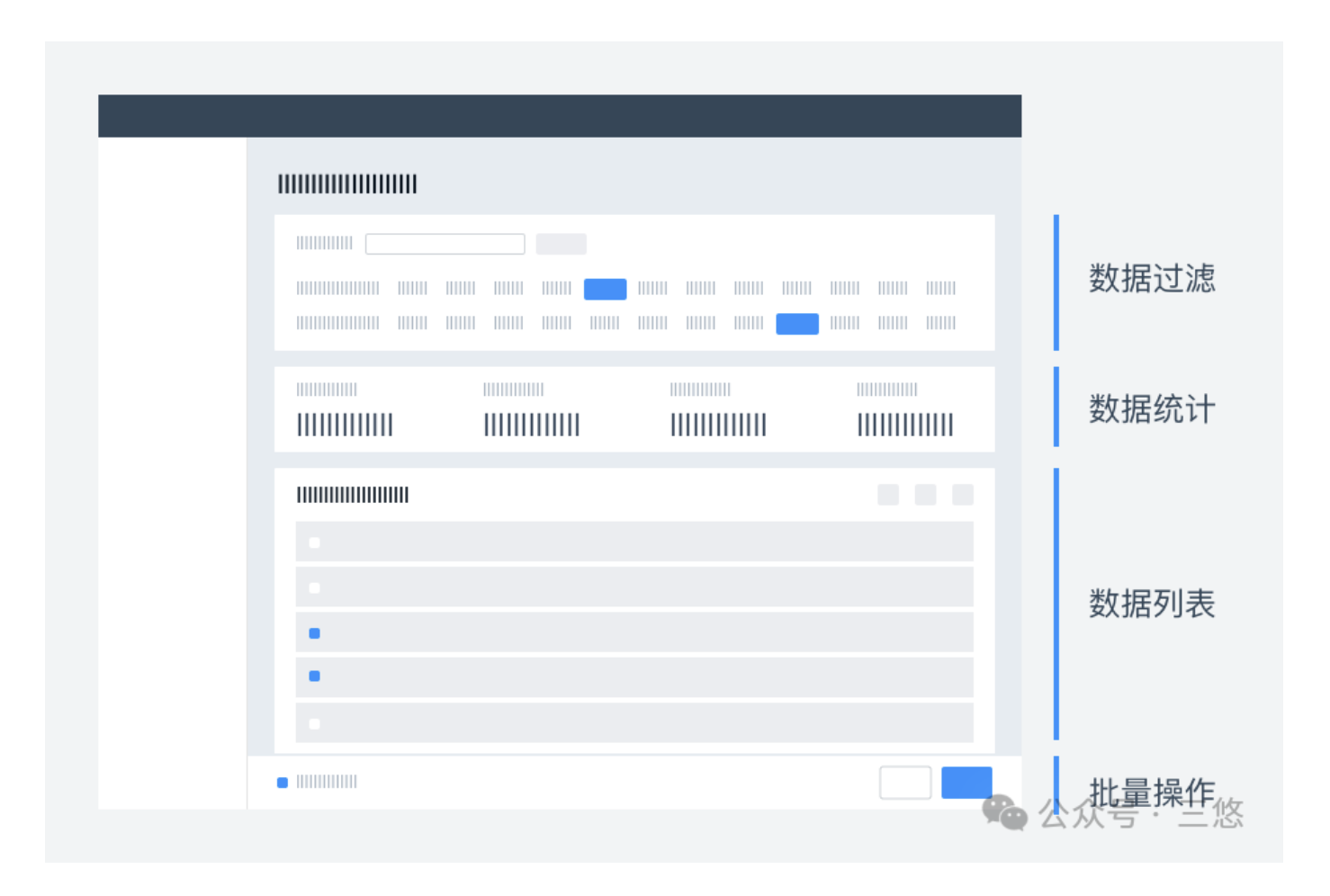 雙欄布局將數據過濾模塊單獨置于左側側欄,右側展示數據統計與數據列表,適合過濾條件較多的場景,既能保留完整的篩選功能,又不影響數據展示區域的完整性。