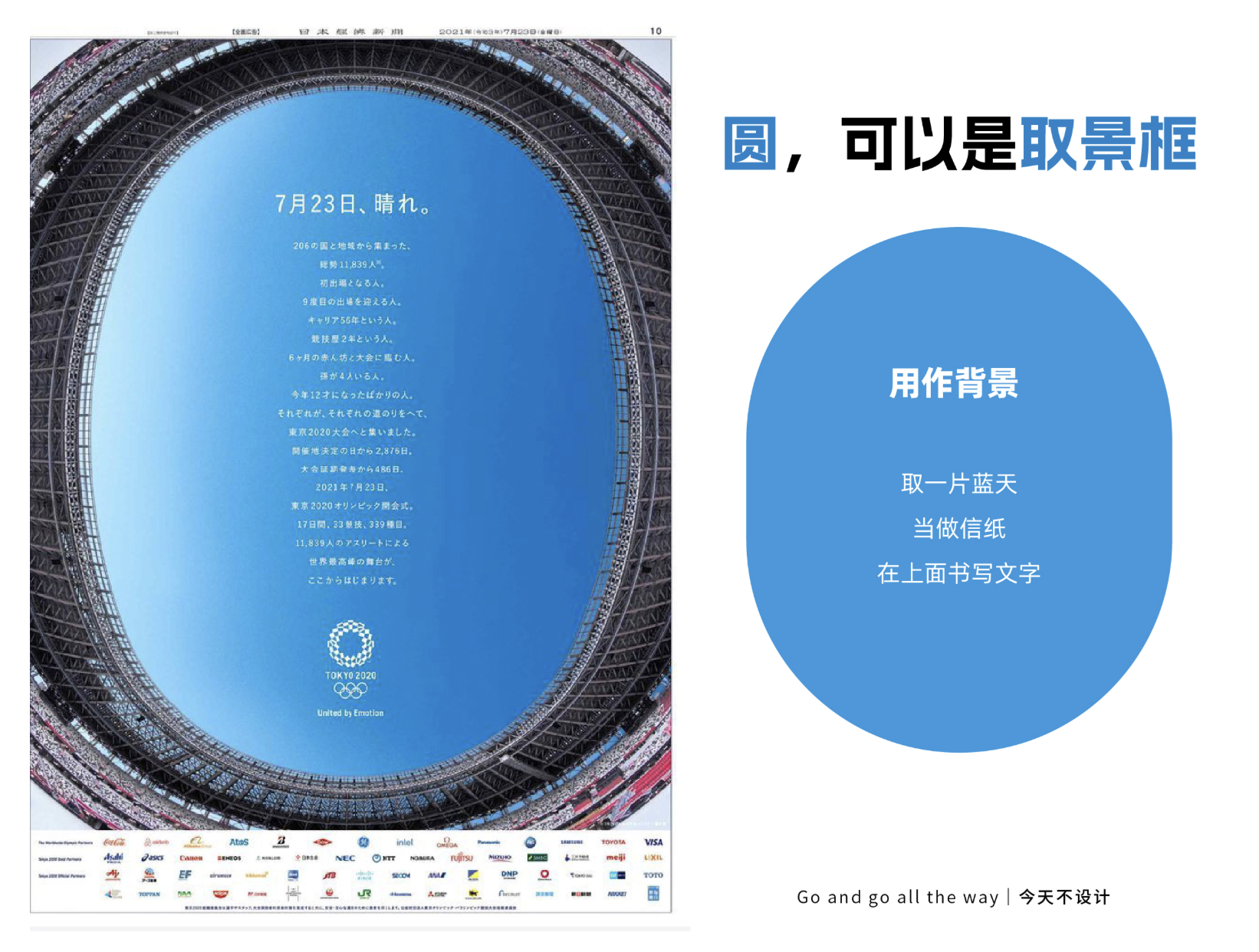 圓形取景框的用法靈活多樣,可作為背景承載信息。東京 2020 奧運會相關海報中,設計師用簡潔的圓形作為 “信紙” 載體,在其中書寫大會倒計時、參賽人數、比賽項目等信息,圓形的規整與文字的排列形成呼應,既清晰傳遞了核心信息,又避免了文字堆砌的雜亂感,同時藍色圓形與天空背景融合,呼應 “United by Emotion” 的主題。
