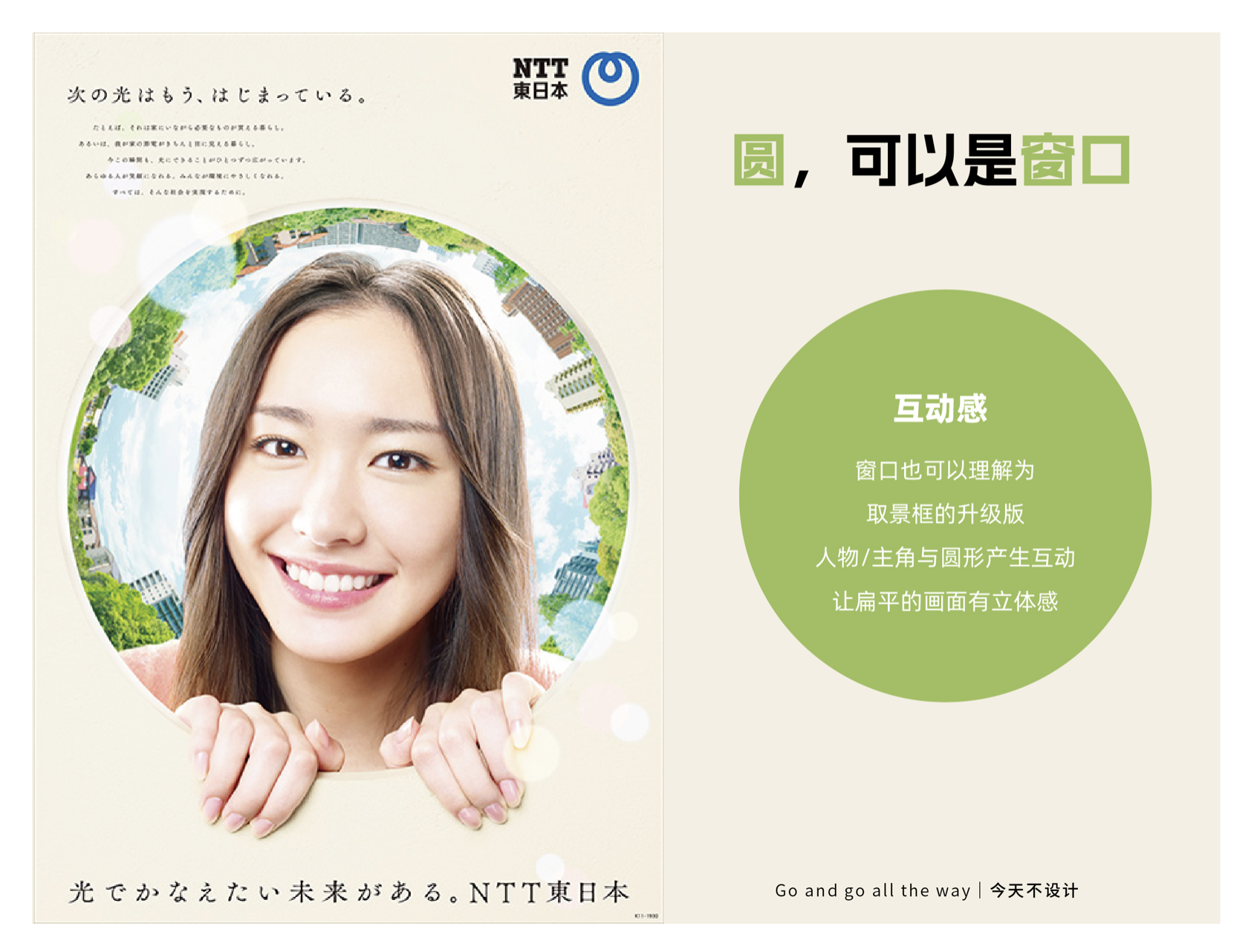窗口式圓形可通過互動營造立體氛圍。NTT 東日本的品牌海報中,設計師將圓形化作 “光的窗口”,畫面中的人物似乎正透過窗口望向未來,光線從圓形中溢出,與背景的深色形成對比,既傳遞了 “未來可期” 的品牌理念,又讓扁平的畫面產生了前后景深,立體感十足。這種互動感打破了海報的二維局限,讓觀者感受到 “窗口內外” 的空間差異,情緒上更易產生共鳴。