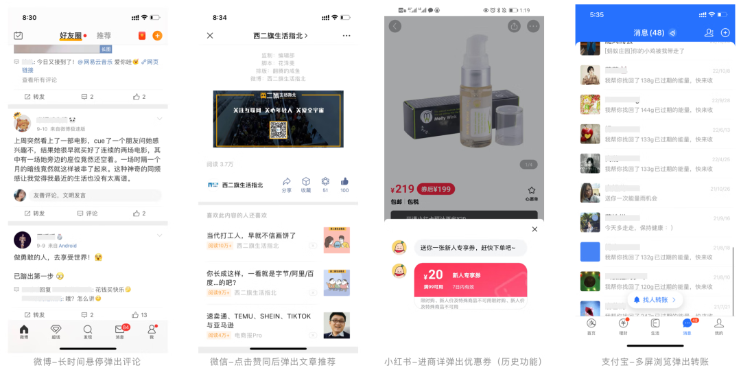 舉例:1)微博長時間懸停引導評論,當用戶在某條內容上停留一定的時間(大約4秒),系統會判斷用戶對該內容有興趣,從而彈出‘評論框’,引導用戶進行評論;2)微信訂閱號在用戶對某條內容點擊“贊同”后,系統會判斷用戶對當前內容較為認可,會向下彈出更多文章推薦,引導用戶閱讀;3)小紅書進入商詳后會彈出優惠券,通過權益激勵引導用戶購買;4)用戶在支付寶消息列表中滑動瀏覽多屏后,會出現“找人轉賬“的提示,點擊后進入朋友列表的純凈模式(去掉類服務通知等跟轉賬無用的列表),提高了用戶的尋找效率。