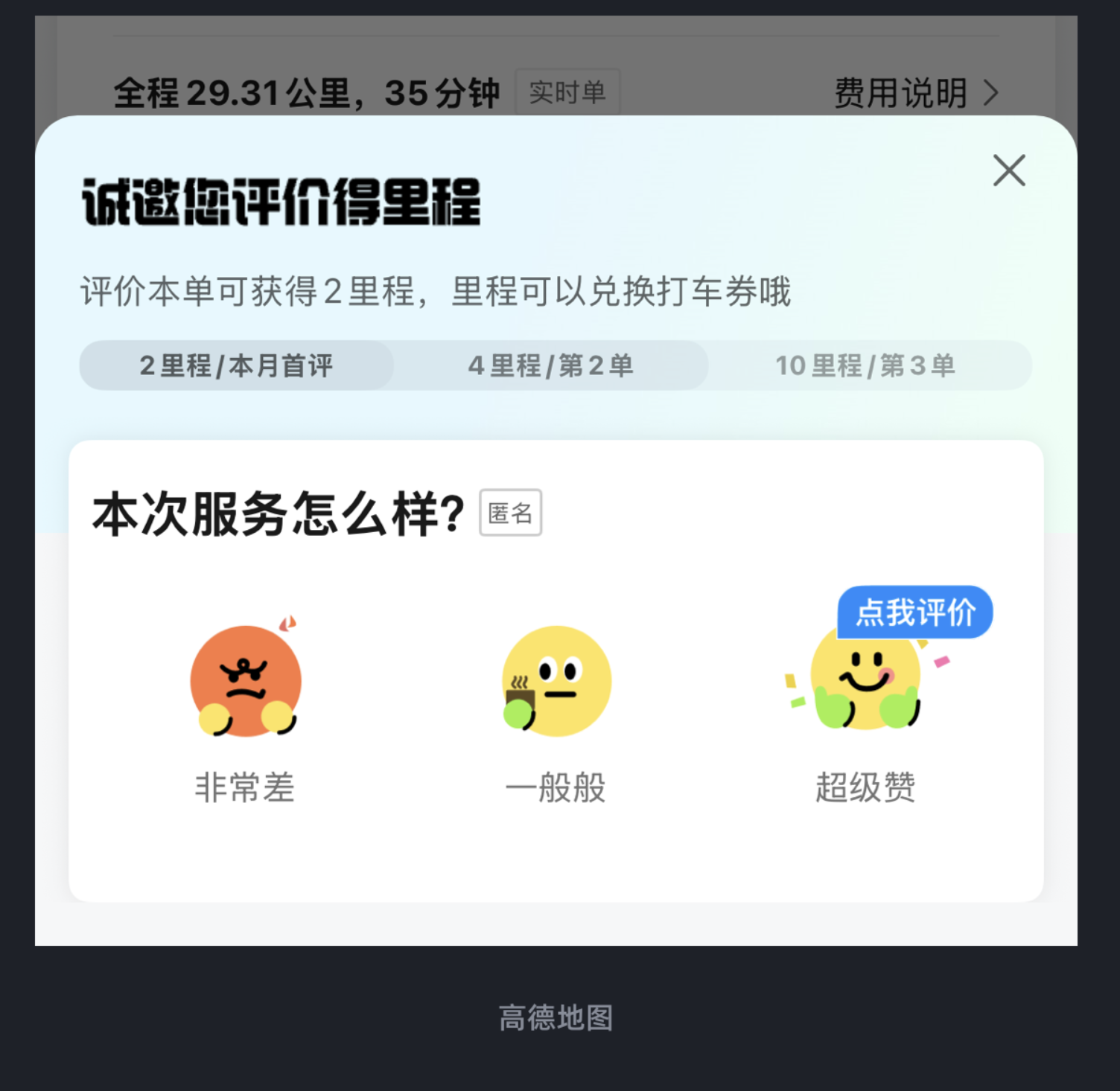 高德地圖在打車服務結束后,設計了多維度的反饋場景。不僅會詢問 “車內空氣是否清新” 等具體服務細節,還推出 “評價得里程” 的激勵機制 —— 用戶評價后可獲得里程,進而兌換打車券。這種設計一方面能幫助平臺收集真實反饋,推動司機服務優化;另一方面讓用戶意識到自己的意見能直接影響后續服務質量,同時獲得實際福利,從而更愿意主動參與反饋,形成良性循環。