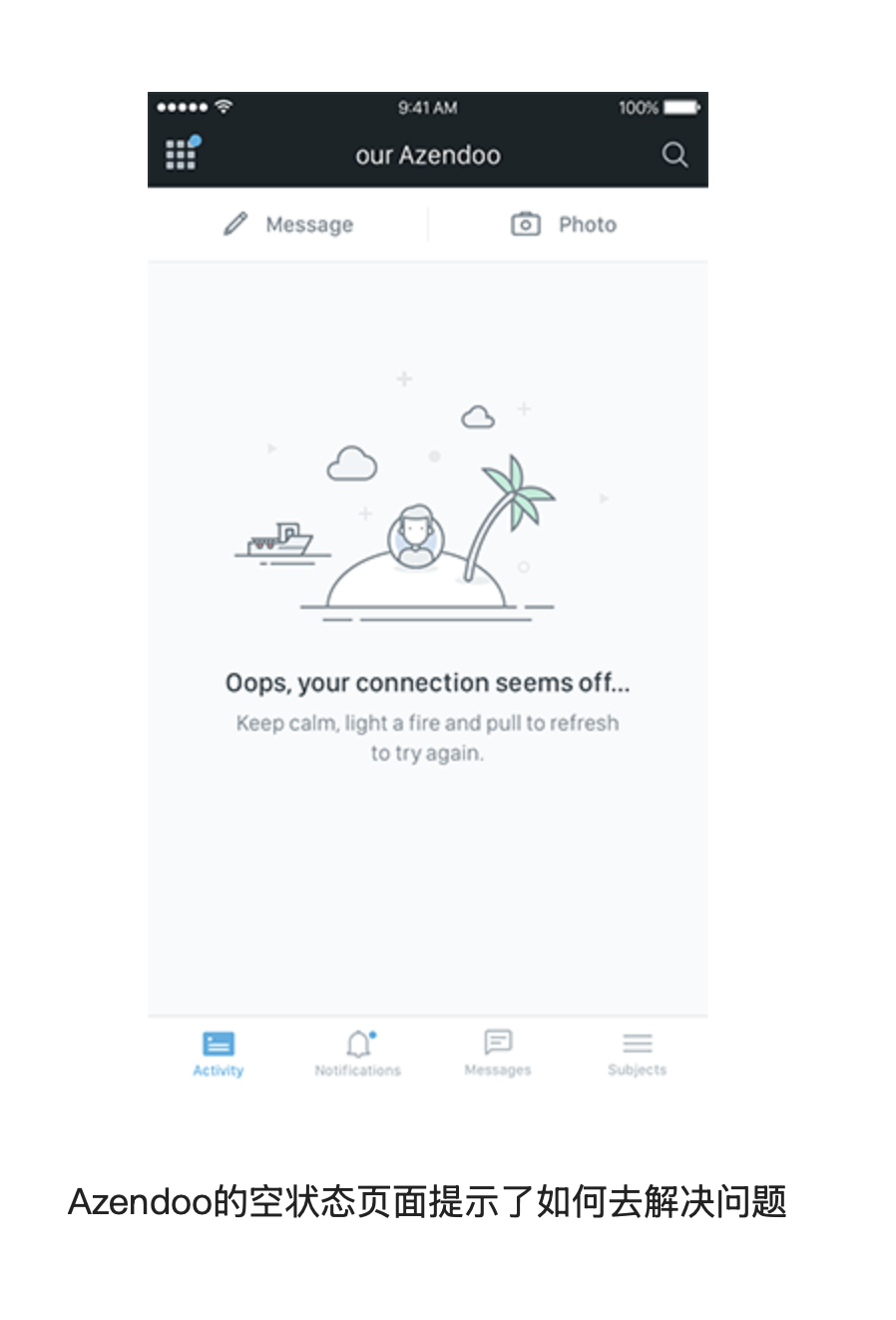 空狀態(tài)、錯誤提示頁面不應(yīng)是毫無指引的空白界面。當(dāng)用戶遇到網(wǎng)絡(luò)斷開、操作失誤或內(nèi)容為空時,空白頁面會讓用戶不知所措,甚至直接退出 App。優(yōu)秀的空狀態(tài)設(shè)計應(yīng)提供明確的解決方案 —— 比如告知用戶 “網(wǎng)絡(luò)連接失敗” 后,給出 “下拉刷新重試” 的指引;內(nèi)容為空時,建議用戶 “添加第一條內(nèi)容” 并提供操作入口。某協(xié)作類 App 在網(wǎng)絡(luò)斷開時,會顯示 “連接似乎中斷了... 冷靜下來,下拉刷新再試一次” 的提示,既緩解了用戶的焦慮,又給出了具體操作路徑,有效降低了用戶流失率。