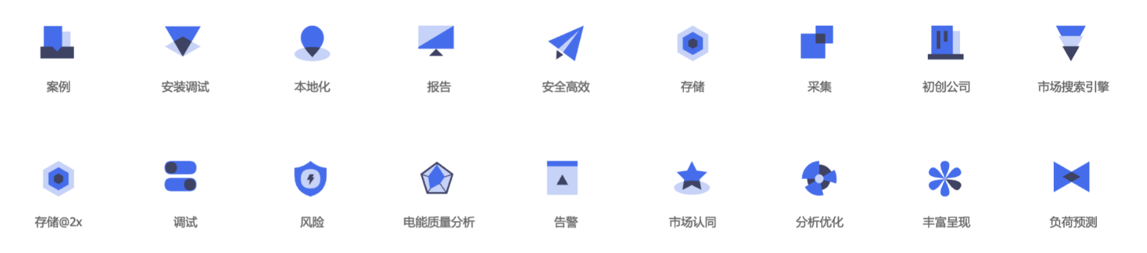 1. 面性圖標(基礎款):以純色填充為主,造型簡潔、分量感強,傳遞穩定、安全的感覺。適合企業服務、工具類產品,比如指揮中心、綜合管理、個人賬號管理等功能模塊。使用時要注意與其他界面元素的體量平衡,避免因過于厚重破壞信息層級。