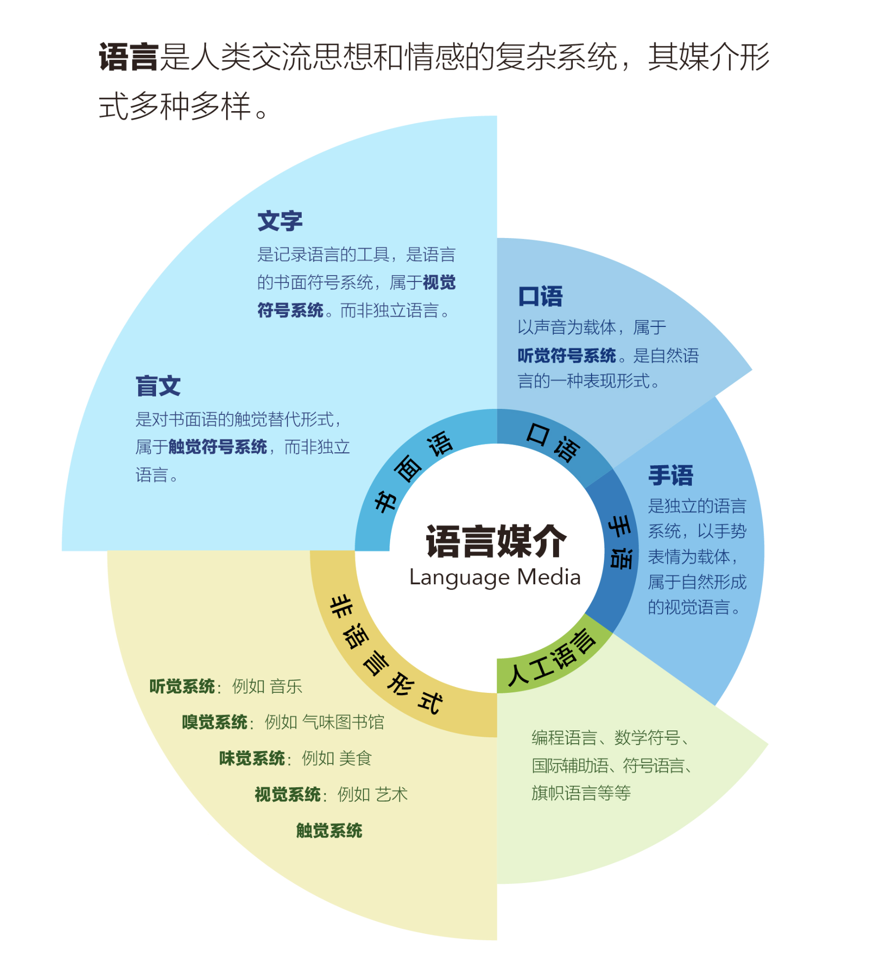- 自然語言:依托人類自然交流形成,是最基礎(chǔ)的語言媒介,包含口語、手語、書面語三大類。其中口語以聲音為載體,屬于聽覺符號(hào)系統(tǒng);手語以手勢(shì)、表情為載體,是獨(dú)立的視覺語言系統(tǒng);書面語則包含文字與盲文,文字是記錄語言的視覺符號(hào)工具,盲文則是書面語的觸覺替代形式,歸屬于觸覺符號(hào)系統(tǒng)。