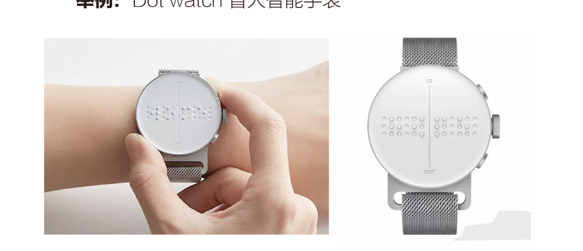 韓國 Dot Incorporation 公司研發(fā)的 Dot watch 盲人智能手表,則讓盲文與現(xiàn)代科技完美融合。表盤的 24 個(gè)盲點(diǎn)可通過上下浮動(dòng)形成盲文凸點(diǎn),不僅能清晰 “訴說” 時(shí)間,還能將短信、社交信息、來電姓名與號(hào)碼實(shí)時(shí)轉(zhuǎn)化為盲文,讓視障人群無需等待即可獲取信息;同時(shí),手表支持私密瀏覽備忘錄,真正打破了視障人群的信息接收壁壘,讓科技為盲文賦能,讓設(shè)計(jì)服務(wù)于生活。