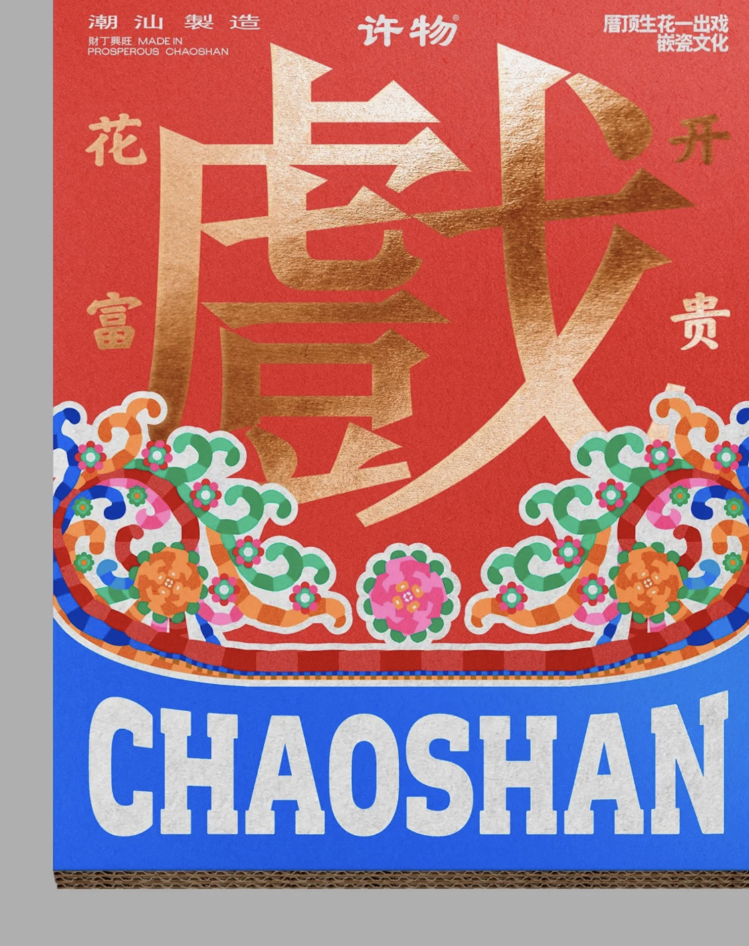 在視覺表達上,他采用極具沖擊力的視覺形式,將潮汕文化符號與潮流設計手法結合。黑紅為主的經典配色,既契合潮汕文化中喜慶、莊重的氛圍,又符合當代潮流的審美偏好;粗糲有力的字體設計,搭配 “CHAO SHAN” 的英文字樣,讓地域文化與國際潮流接軌;將嵌瓷的凹凸質感、木雕的紋樣細節轉化為平面視覺符號,讓非遺技藝的美感在海報、文創產品中被直觀感知。同時,他將傳統人物的人設標簽與視覺形象結合,讓薛仁貴、蓋蘇文的形象兼具傳統韻味與潮流個性,成為極具識別度的文化 IP。