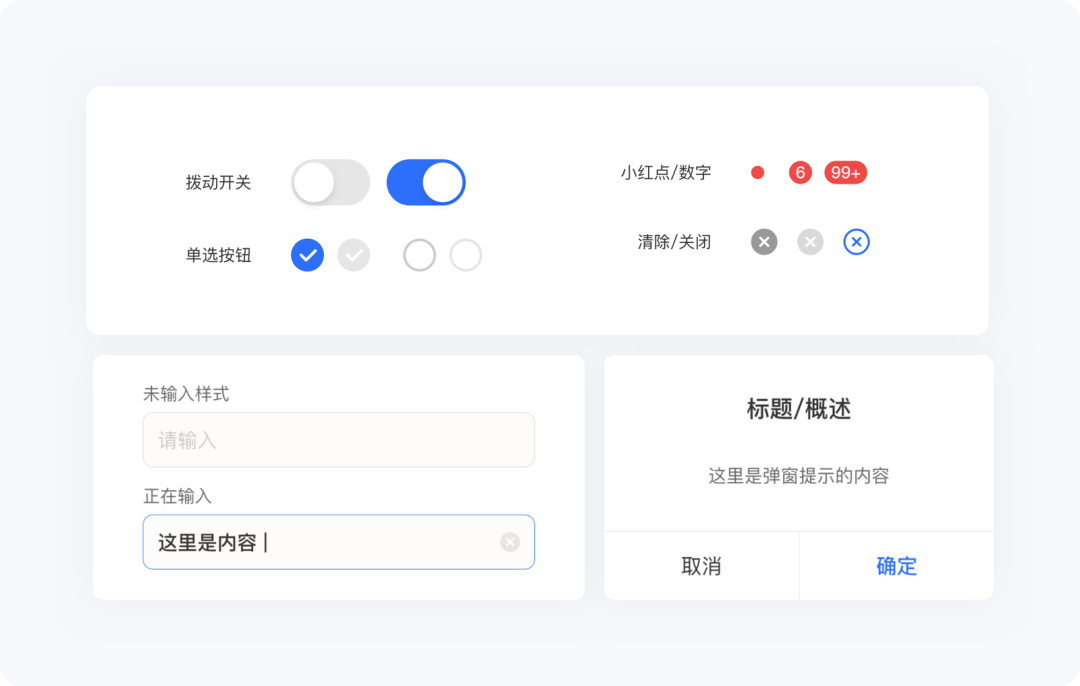 參考原子設計方法論,將原子、分子、組織層級的元素組合、嵌套、精細化歸類,形成可直接調用的功能基礎組件,涵蓋產品設計的核心通用控件,例如:按鈕(不同尺寸、狀態)、彈窗(提示、確認、操作)、表單(輸入框、選擇器、校驗項)、選項控件(單選、多選、開關)等,每個組件都需明確樣式、交互、狀態規范。