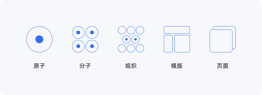- 分子:2 個及以上原子組合而成的功能性單元,如搜索框(輸入框 + 按鈕 + 圖標)、單選按鈕、表單項等;
