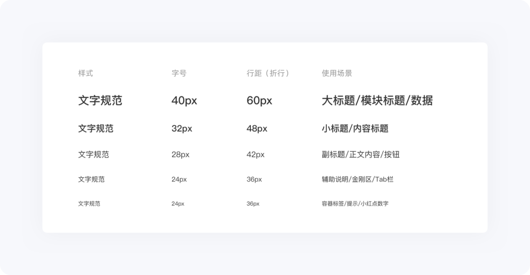 文字規范的核心是明確核心屬性,按場景分類,避免樣式混亂,核心包含 4 個基礎屬性:字體、字號、字重、行高;針對不同使用場景制定對應的文字樣式,并整理成標準化表格,方便查閱與調用。