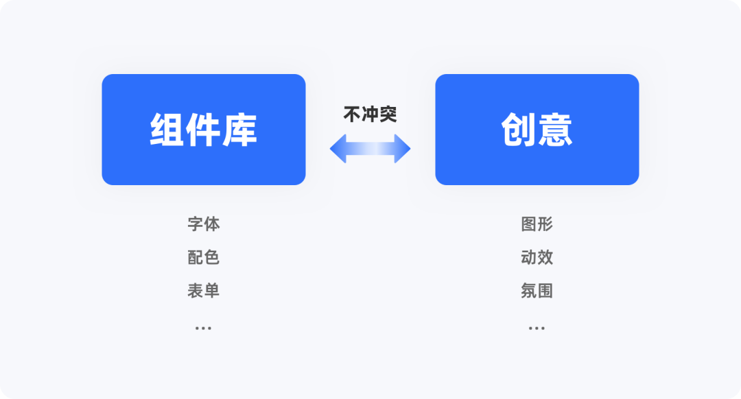 部分設計師認為 “拼組件會扼殺創意”,實則是對組件庫的誤解:組件庫解決的是復用率高的重復性設計需求(如字體、配色、表單、基礎控件),而在圖形設計、動效表現、背景氛圍、視覺亮點等方面,設計師仍有極大的創意發揮空間。