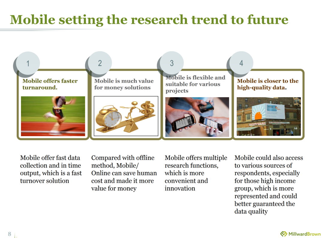 2013 年移動互聯網崛起,智能手機全面普及,調研行業迎來關鍵變革:2012 年還以紙質問卷為主的調研項目,2014 年就已全面切換為 Pad 輔助答題;華通明略當年的內部培訓資料更是精準預言 ——移動調研將成為未來主流,因為它兼具「高效回收、成本更低、觸達高收入人群」三大優勢,這一判斷也被后續十年的行業發展完美印證。