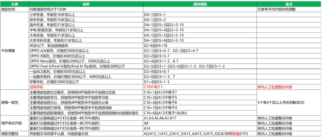 - 填答完整性校驗:葫蘆串式作答、量表打分連續相同(超 4/9 個)、開放題回答無意義(如「哈哈哈」「12345」),均標記無效并人工復核;
